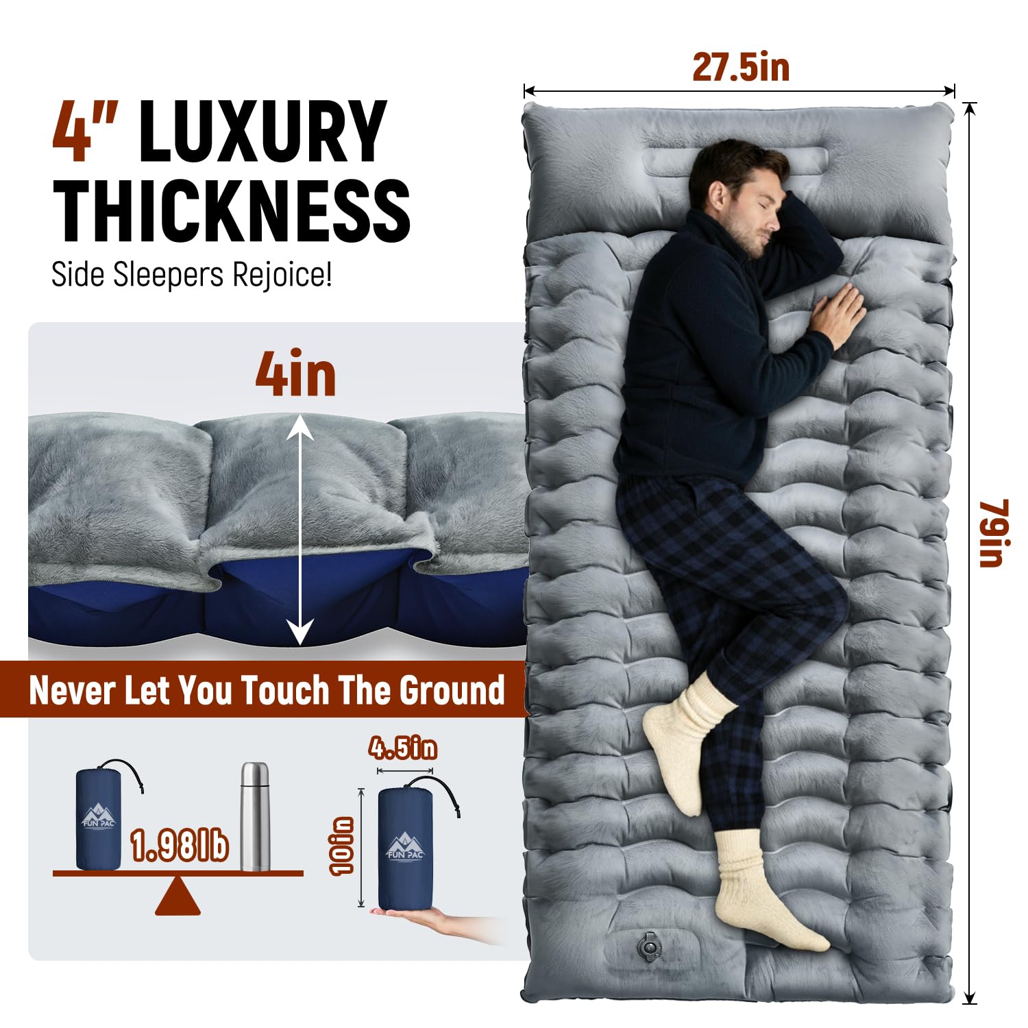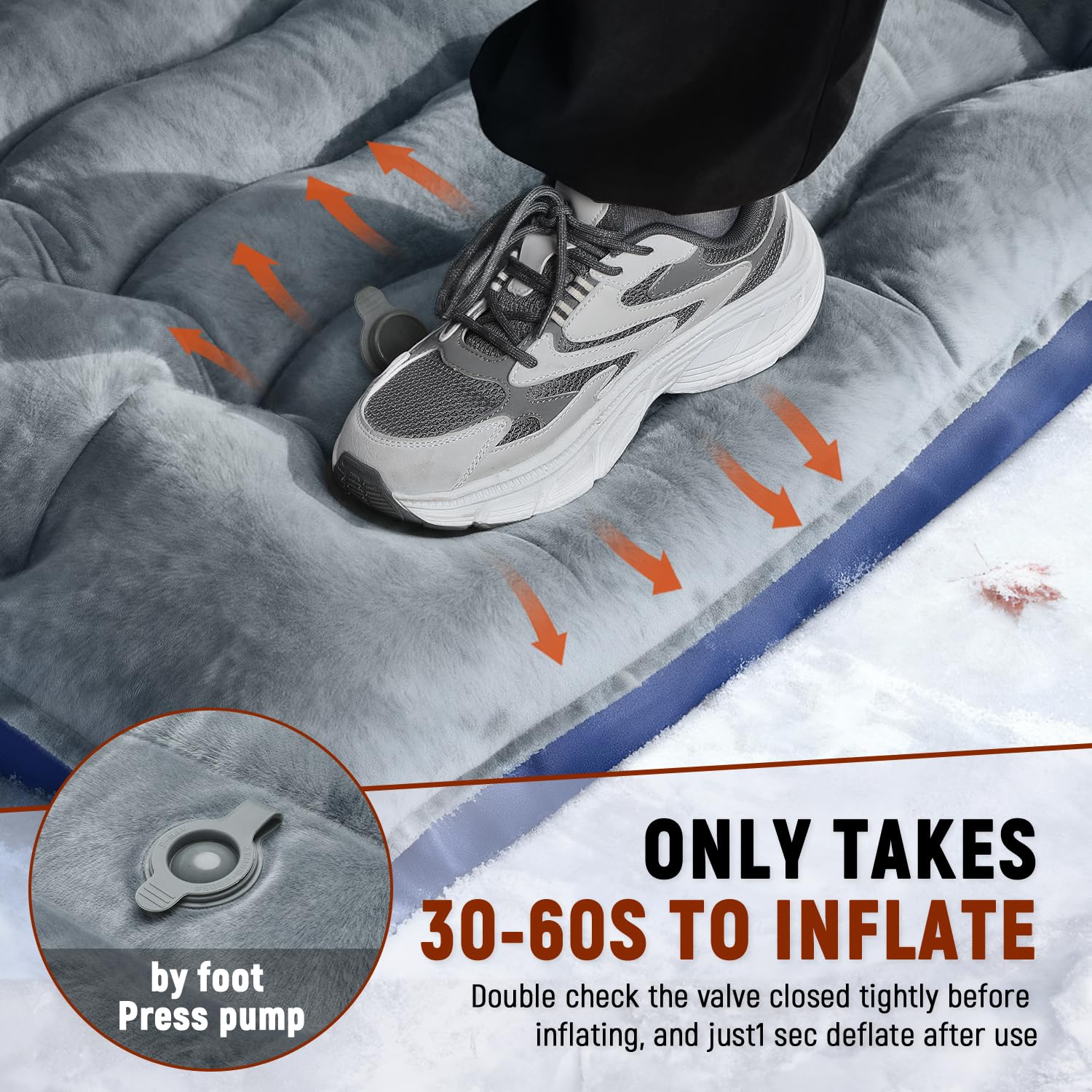 【Effortless 30-60S Second Inflation】Say goodbye to exhausting blowing! Our sleeping pad features a advanced built-in FOOT PUMP. Simply step on it a few times, and it's fully inflated in about 30-60S seconds. No more lightheadedness, just quick and easy setup so you can start relaxing faster.