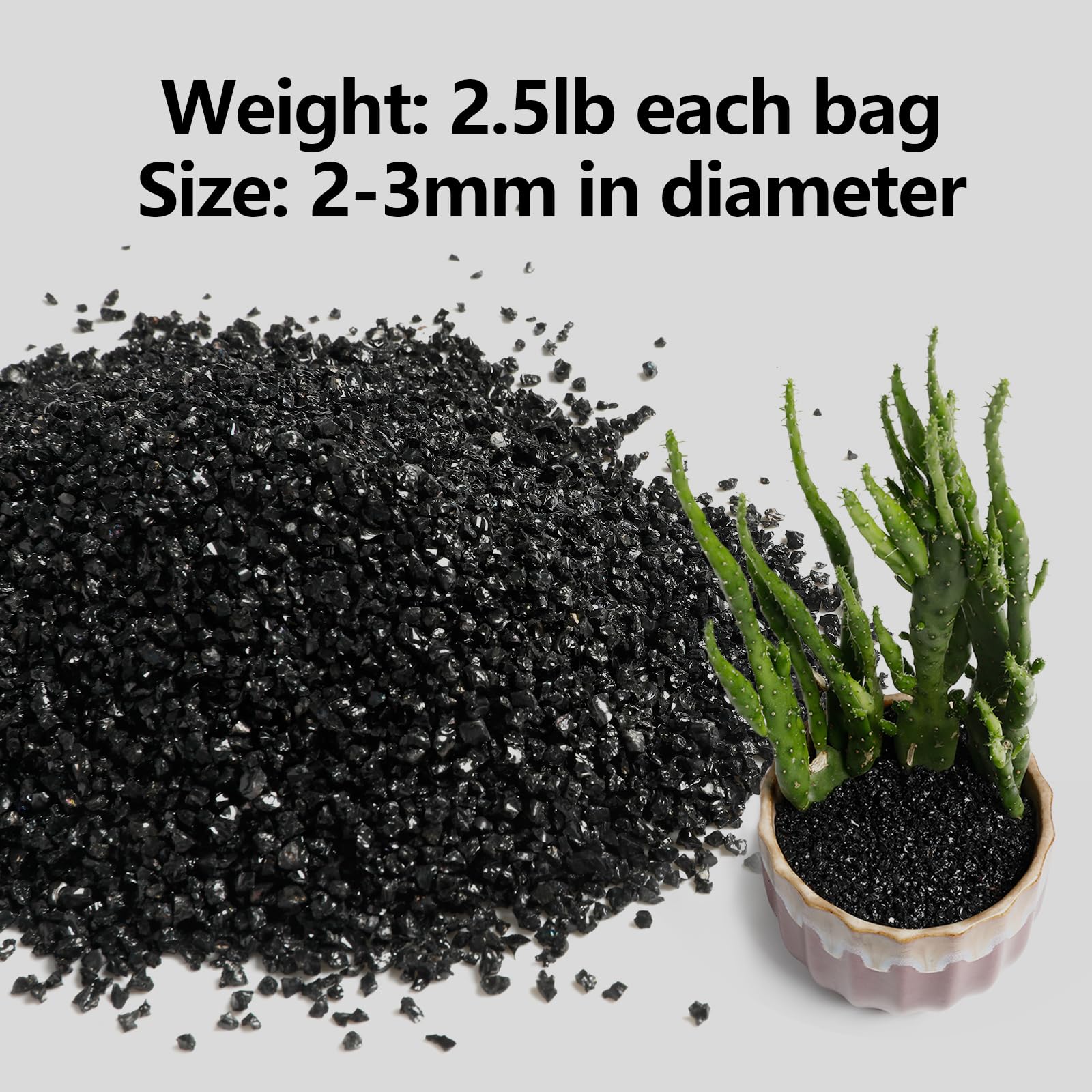 【Great Size】Our little black gravel are sifted and sieved for a perfect particle size( Approx 2mm-3mm) that is ready for direct potting use. It looks great on top as an accent but also great to mix and keep the soil loose for drainage to prevent root rot.