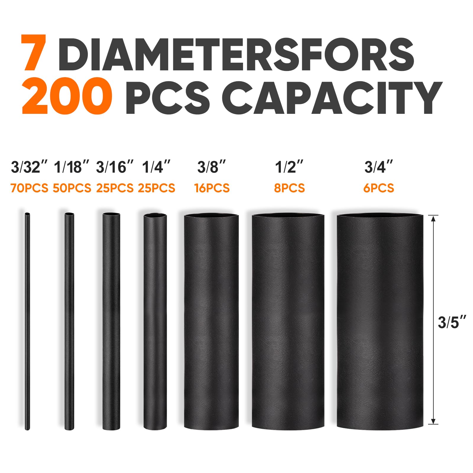 3.54" Variety of Sizes Heat Shrink Tubing: 200pcs 7 most commonly used diameters ranging from 3/32" to 3/4".
