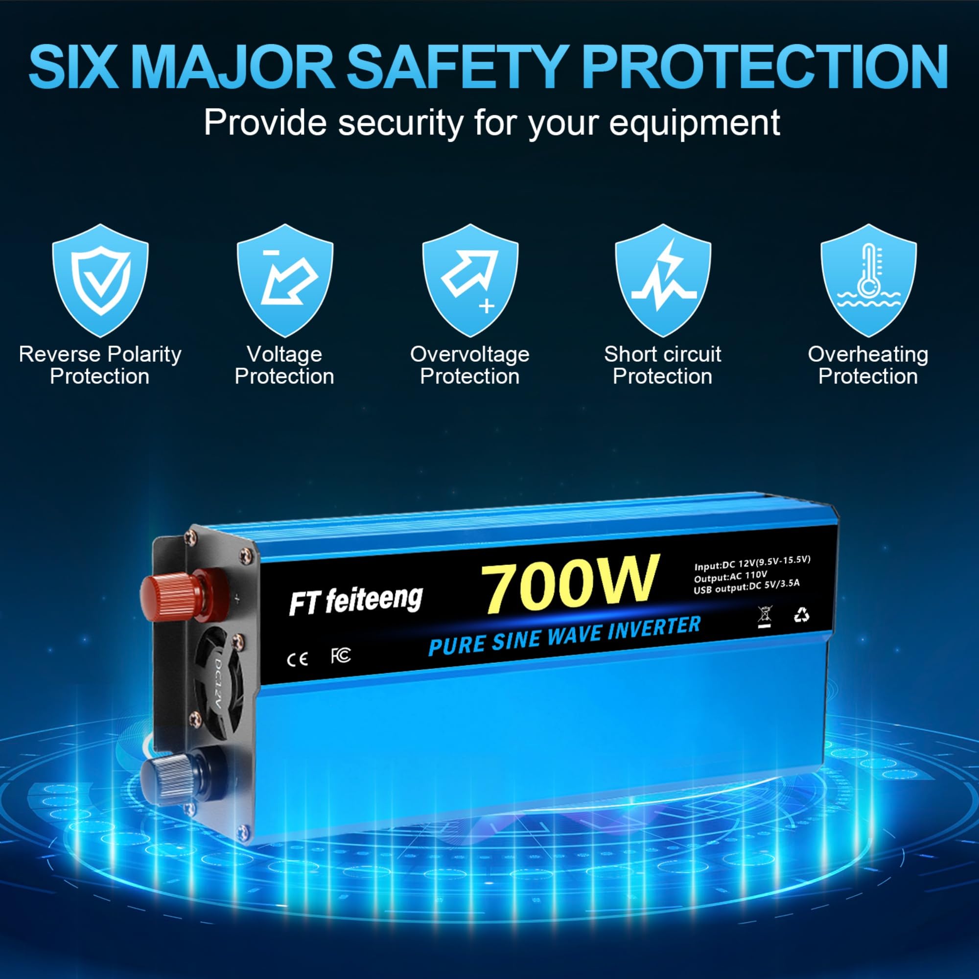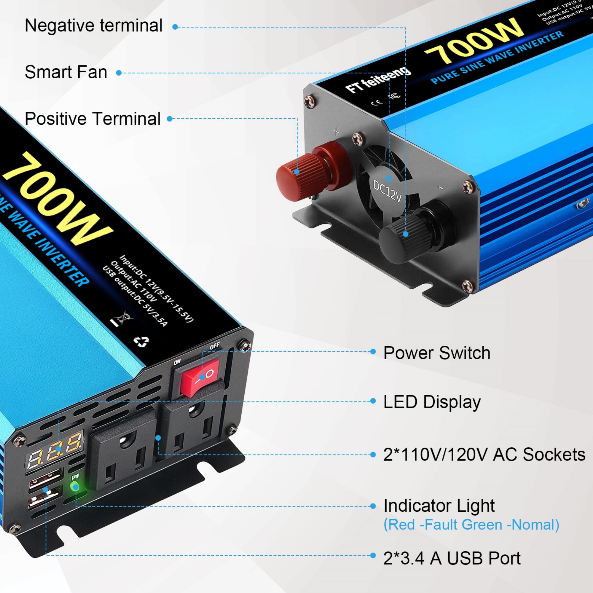 FT FEITEENG 12 VOLT TO 120 VOLT INVERTER: This Inverter Converts 12v Inverter to 110v/120v,It Has US Standard Sockets and 2 USB Charging Interface, Which Can Meet Your Various Power Nee