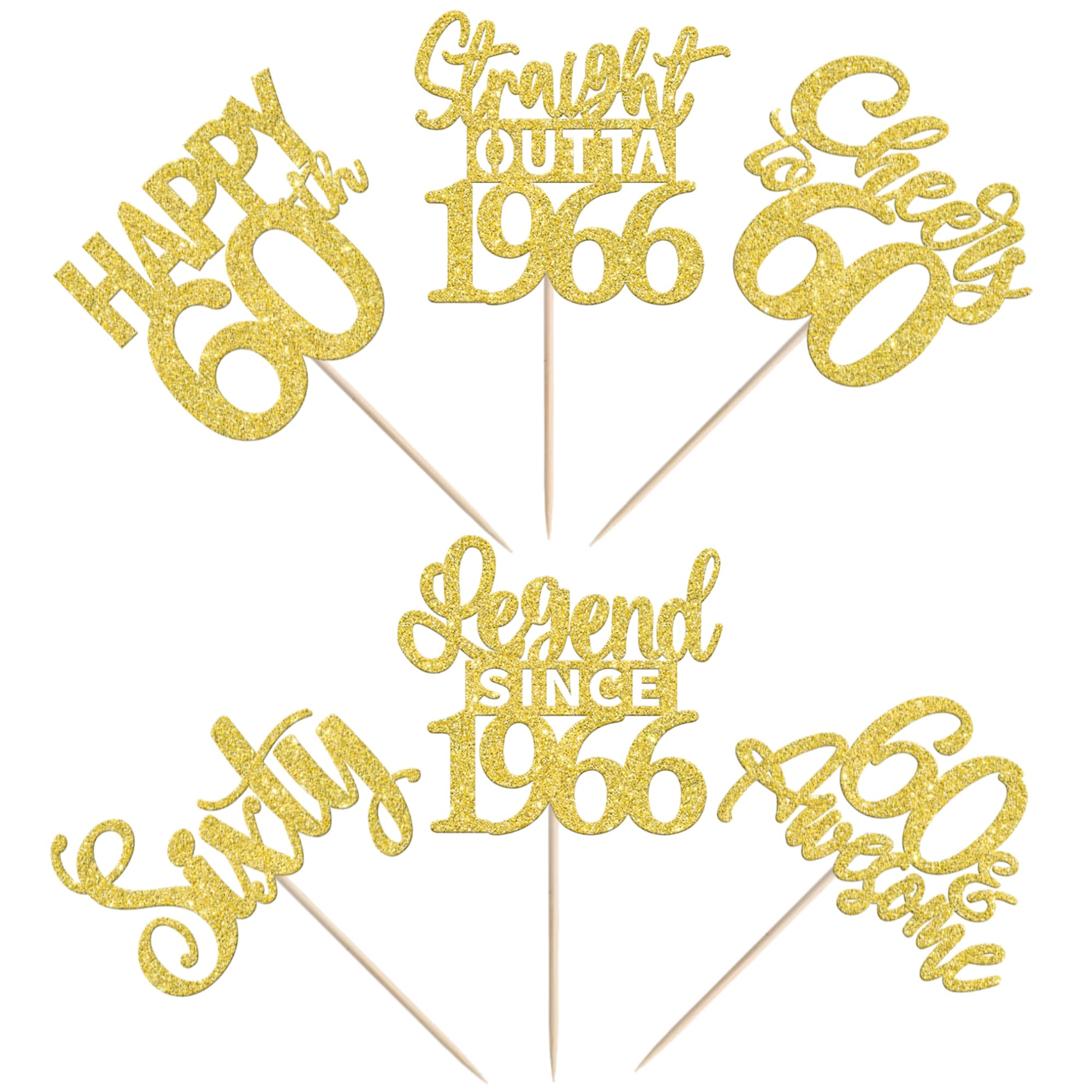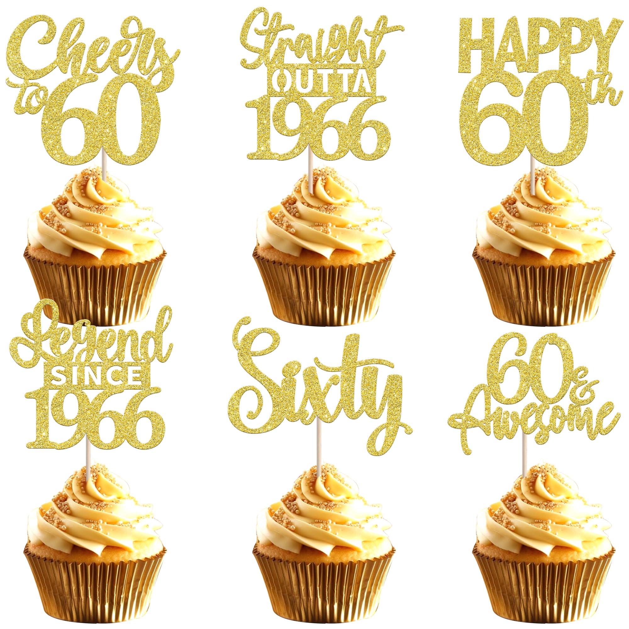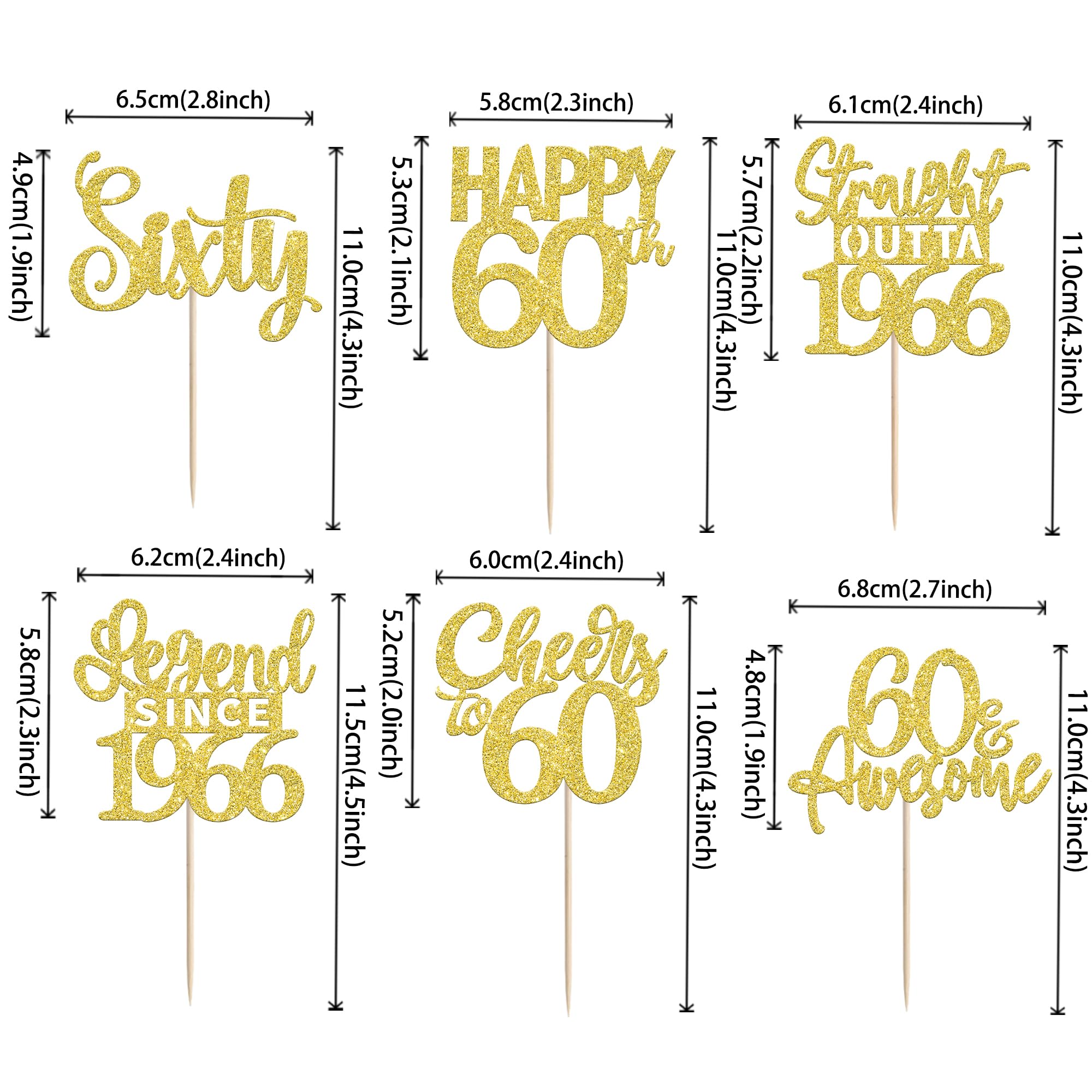 24PCS Happy 60th Birthday Cupcake Toppers Sixty Straight Outta 1966 Cupcake Picks Cheers to 60 Birthday Decorations Lengend Since 1966 Cupcake Decorations for 60th Birthday Anniversary Party Cake Decorations Supplies Perfect for legend since 1966 theme party, 60th anniversary theme party,cheers to 60 years theme party, 60 awesome theme party cupcake decorations supplies. Pack of 24 pcs,4 pcs of each design. The size is 2.3*4.5/ 2.4*4.5/ 2.7*4.5/ 2.4*4.7/ 2.6*3.9/ 2.4*4.7 inch ( with stick ) Made of high quality paper card stock,thick and sturdy. These straight outta 1966 cupcake toppers are one side glitter, another side is white, and they are intended for decoration only, please do not put them in oven or microwave. If the item you received has any defects, please contact us immediately.we will deal with it within 24 hours.