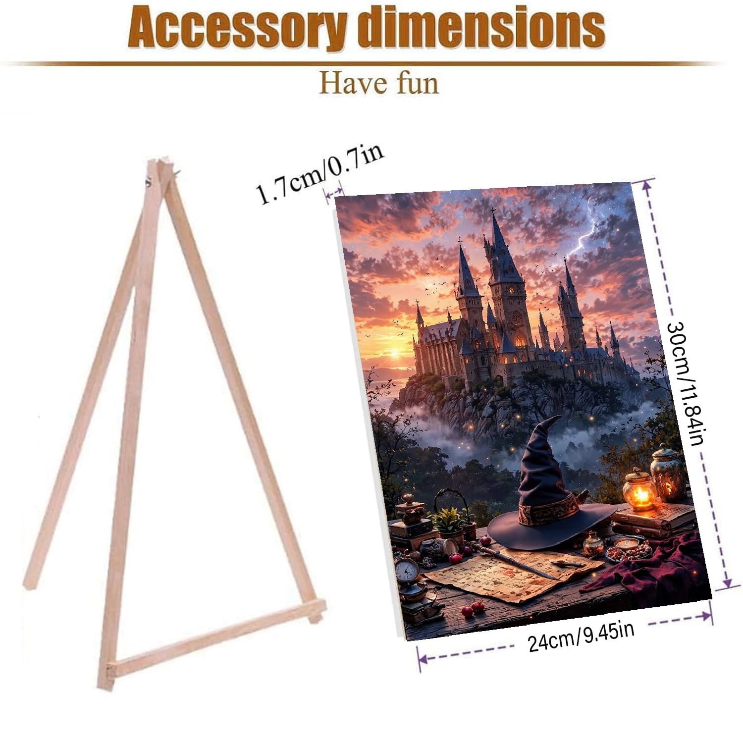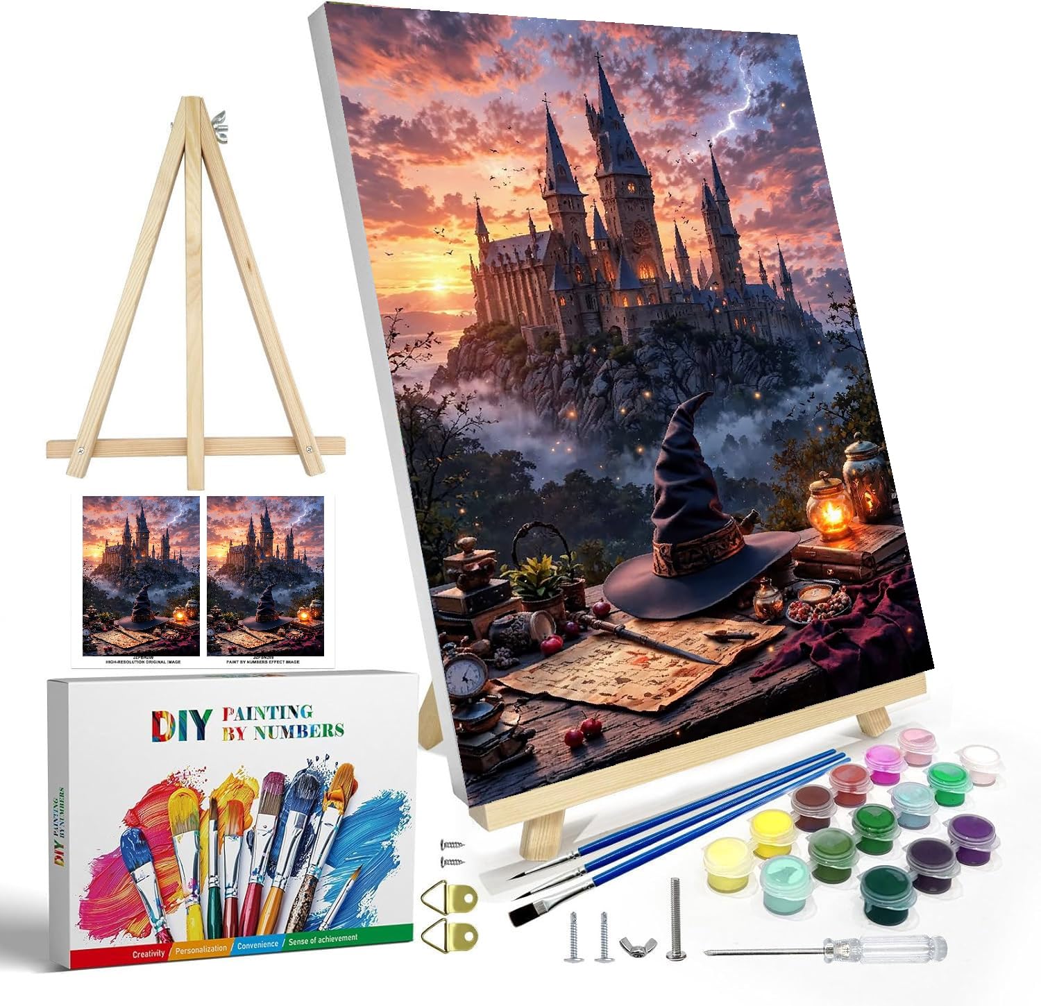 【What You Will Get】1 pack painting, predrawn canvas on frame (size:9.4” x 11.8”), 1 pcs wooden easel, 1 set of acrylic paint, 2 high-quality brushes, 1 instruction manuals, 2 rivets to hang the frame, 1 screwdriver, all packaged in a paper box