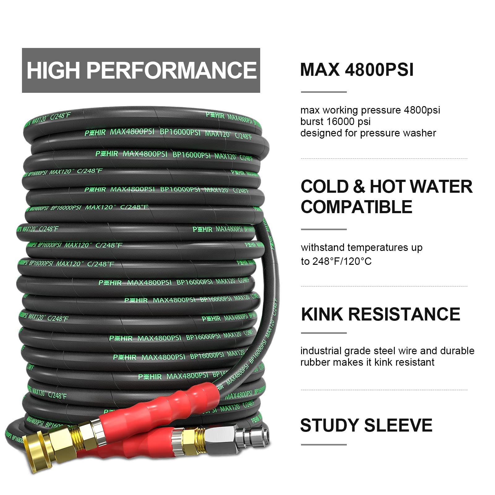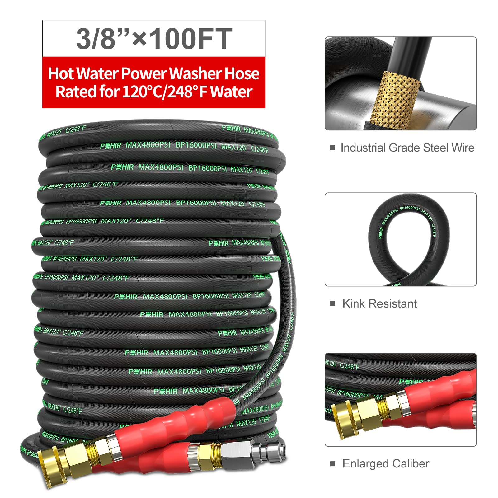 【POHIR Power Washing Hose】The hot water hose 100ft is perfect hose extension, it's durable and able to support quite high working pressure. Inner tube is reinforced with synthetic rubber. Reasonable selection of 3/8"" inner diameter greatly reduces the weight and volume of the hose body, making it more convenient to use and storage. Its innovative high-tech materials and processes can extend the service life and are safe to use, suitable for household cleaning & commercial use.
