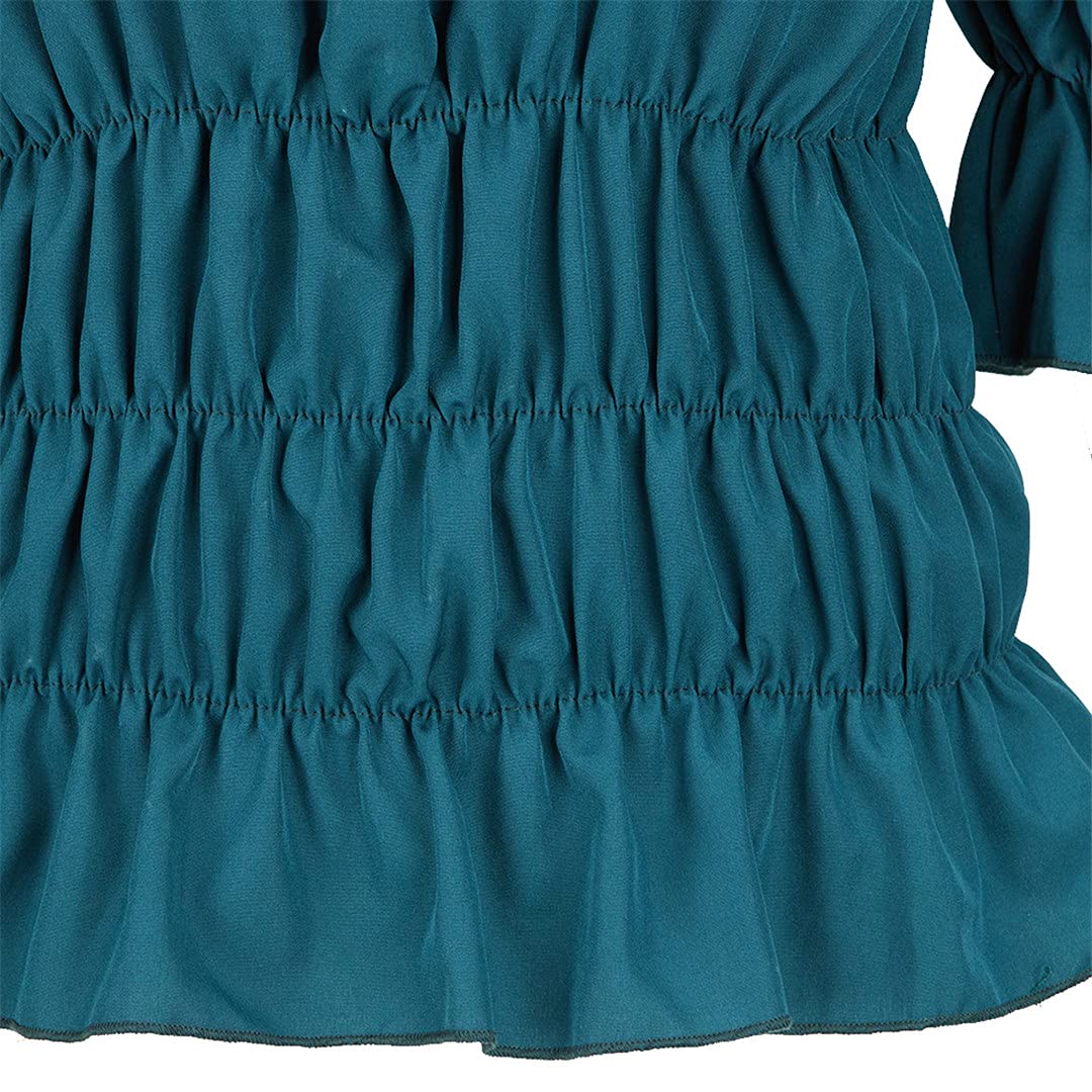 Features: Half sleeves, off the shoulder design with ruffle features, neckline with elastic band, smocked waist.