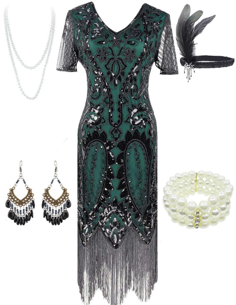 Package include: 1 x 1920S Sequin Tassel Flapper Dress , 2 x Pearl Necklace ; 1 x Long Satin Gloves; 1 x Headband ; 2 x Earrings ; 1 x Pearl Bracelet ; 1 X Pearl Brooch ; 1 x Pearl Open Ring.