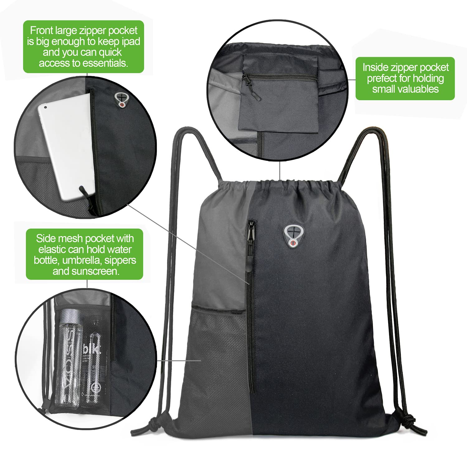CONVENIENT MULTI POCKETS: 20" tall full length and 10" width front large zipper pocket is perfect to keep odds & ends handy without digging thru the entire gym backpack women. An extra inside zipper pocket measures 7 " x 7", big enough for holding small valuables such as sport watch,wallet, cellphone to avoid any pickpockets. Another Side mesh pocket with elastic on the front of sport bag backpack can hold the water bottle, umbrella, sippers, and sunscreen.
