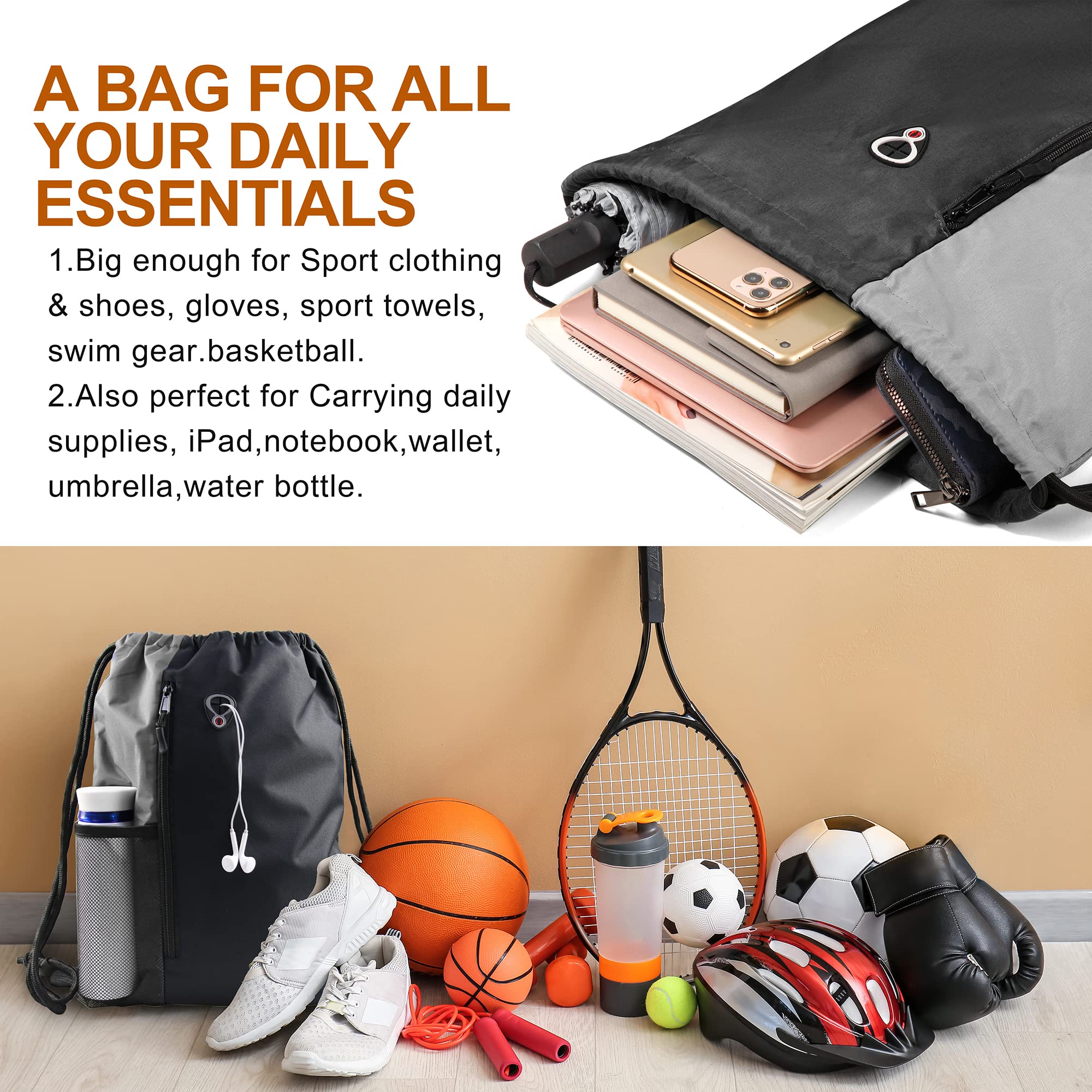 ENHANCED DURABILITY & COMFORT: These Gray Sport bag black and Grey for gym is made of High-Density Oxford which is SUPER durable and withstands daily wear and tear. Drawstring closure makes you store things quickly and take them in and out easily. Thick drawstrings avoid from digging into your shoulders and help reduce your shoulder burden.