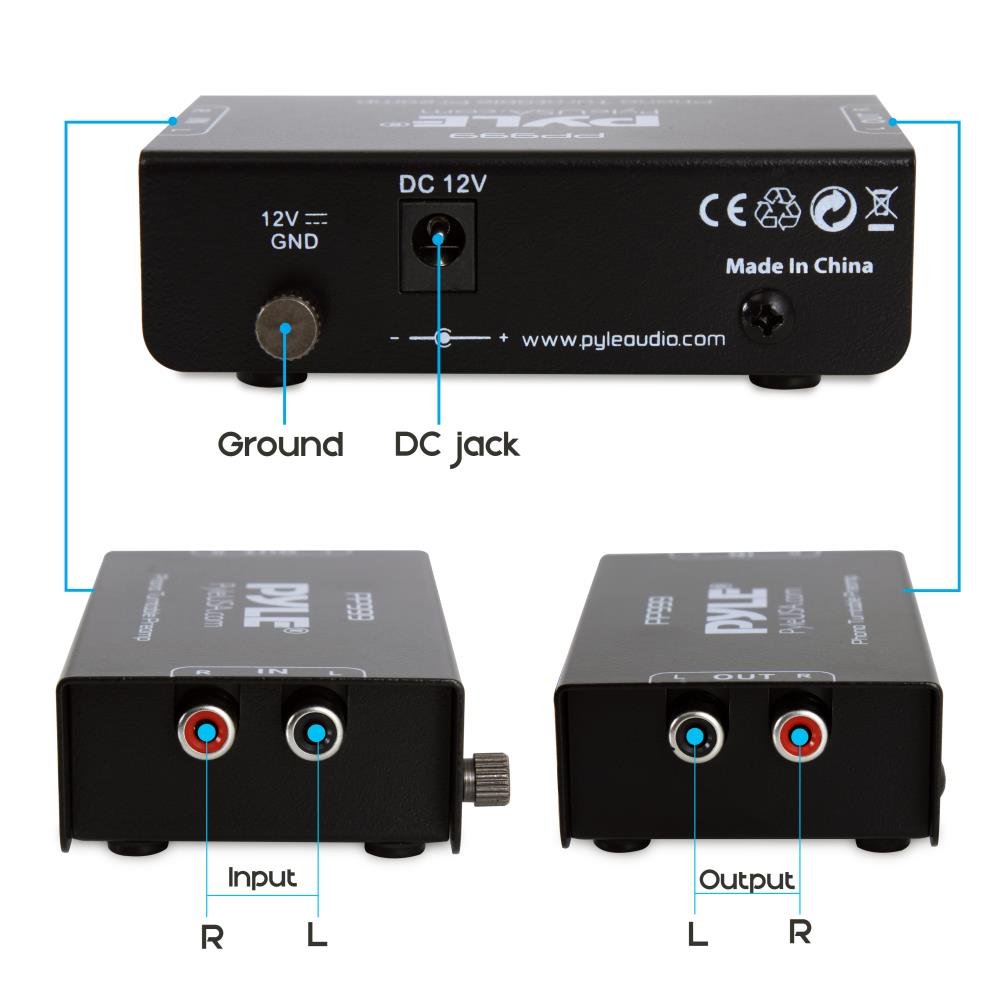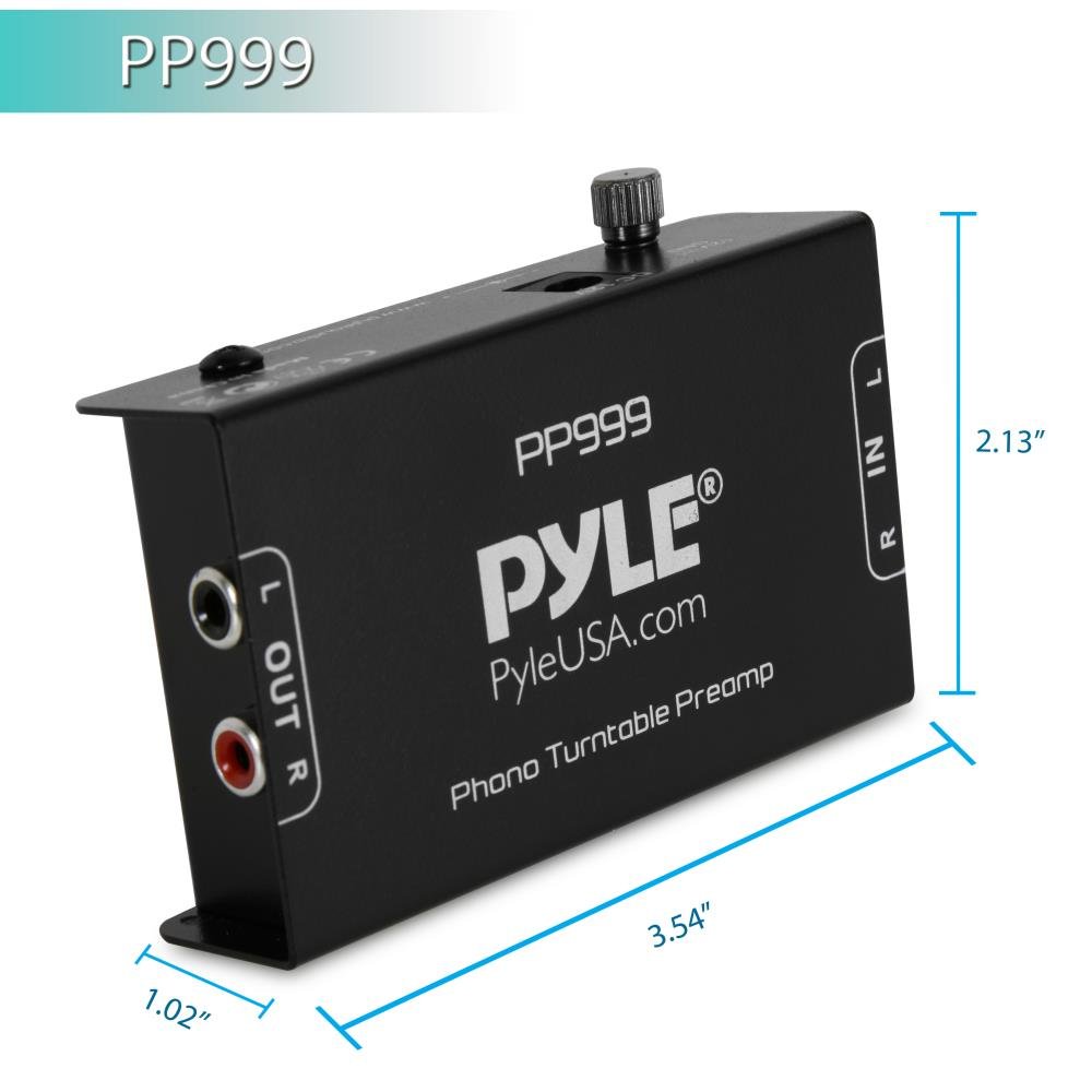 From the Manufacturer PP444 PP555 PP999 PHE300 PHE400 Turntable / Phono Pre-Amplifiers Noise / Hum Eliminators Jacks RCA & 1/4'' RCA & 1/4'' RCA 1/4'' TRS 1/4'' TRS & XLR & 12V DC Adaptor ✔ ✔ ✔ Product Description PylePro Model : PP999 Compact Ultra-Low Noise Phono Turntable Compact Ultra-Low Noise Phono Turntable Preamp with 12-Volt Adaptor - Preamplifier Converts Phono Signals to Line Level Signals 12-Volt DC 110V Adaptor Included Dedicated RCA Connectors Output Level: 2V Reference Voltage: 1V Load Impedance: 10K Ohms S/N Ratio (with A-WTD): 70 dB T.H.D. : 0.08 for 1 KHz 3 mV Input Frequency Response:20 Hz ~ 20 KHz ±2dB Input Sensitivity / Impedance / Phono - 3 mV / 50K Ohms Dimensions (W x H x D):3.54'' x 2.13'' x 1.02'' Weight : 0.88 Lbs This electronic preamplifier stands up to the test and will provide you with serious sound performance. The PP999 is perfect for bringing your studio equipment's phono-level output to a more suitable and manageable line-level output. It'll take your audio signal, amplify its strength and prepare it for further processing by your receiver or amplifier. Preamps technically provide voltage gain to your desired equipment and are key to assisting the signal source. The ultra-low noise audio conditioning circuitry allows the preamp to boost audio to levels that are more manageable for various types of audio equipment. You'll find it easier to adjust the recording level volumes of different sources and instruments alike. You should position your preamp close to the source to reduce unwanted noise and interference. Preamps can sometimes come built into the stereo equipment, but if that's not the case, the PP999 is an easy install, wise choice and great addition to any musician or producer. Take your sounds and audio production skills to the next level with the PP999 Preamplifier.