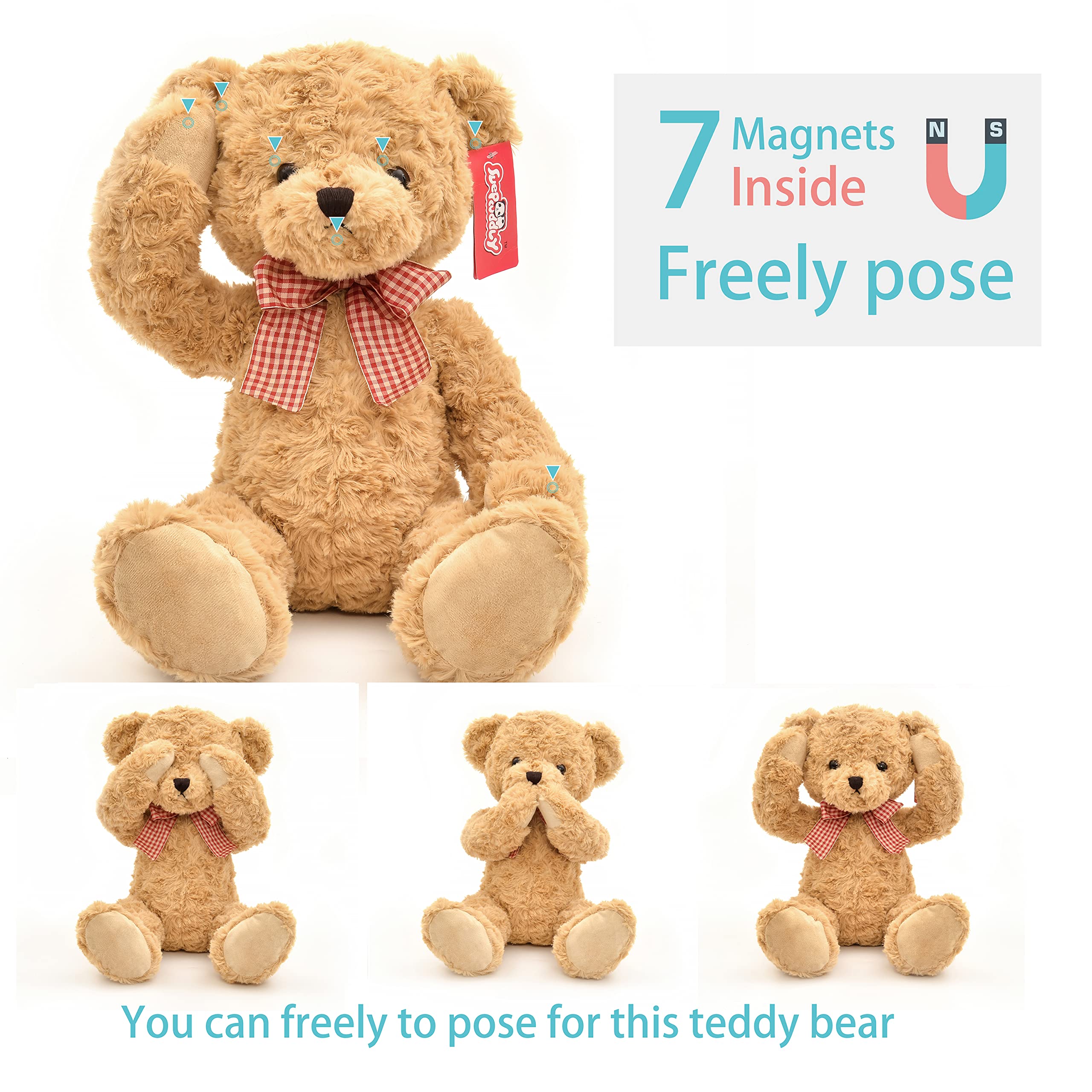 This 20inch posed teddy bear stuffed animals can freely posing, because the teddy bear has 7 magnets in the ears hands jaw.