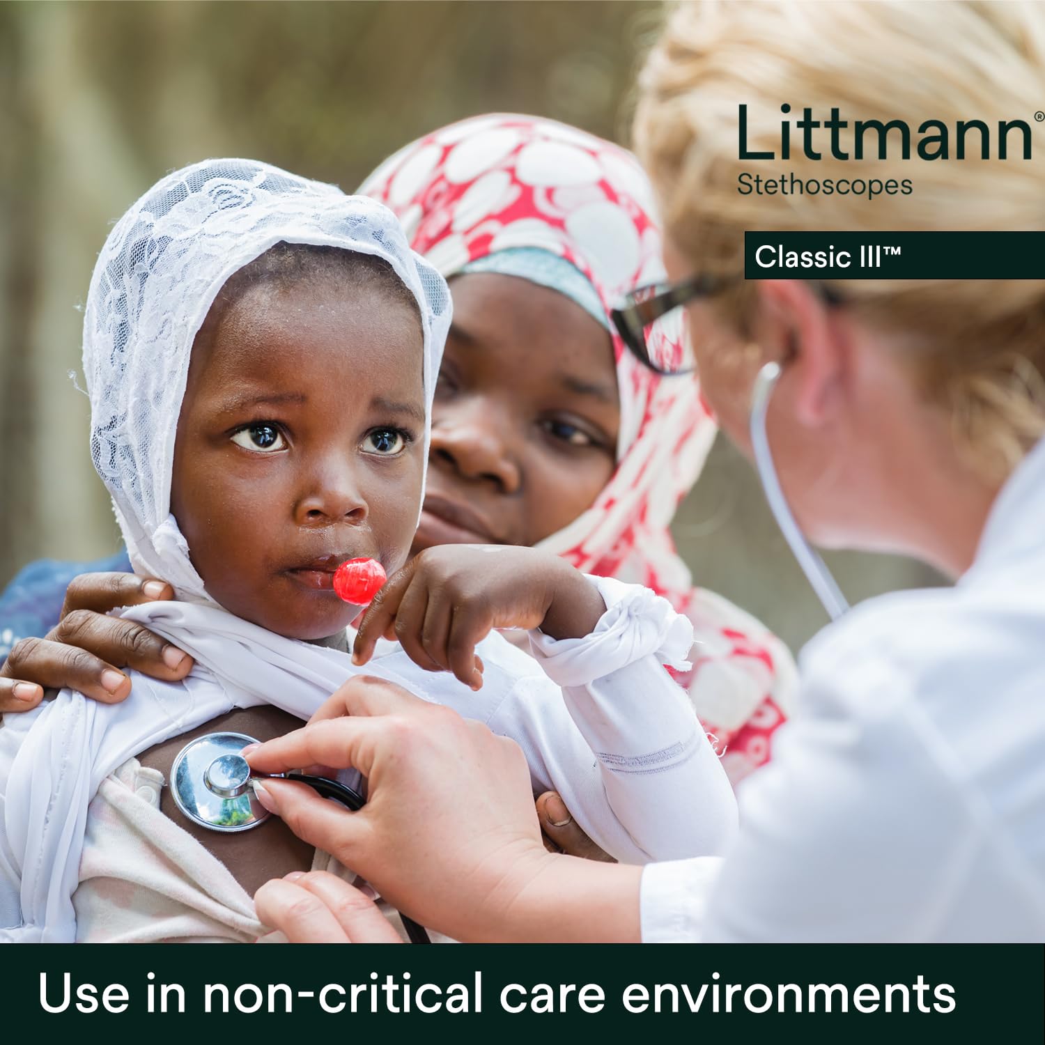 Product Description Love your stethoscope The compact and sensitive Littmann Classic III stethoscope is the perfect instrument for clinicians who monitor and assess children or adults in non-critical environments. Manufactured with strong yet lightweight materials for hours of comfortable use. The 3M™ Littmann® Classic III™ Stethoscope is the latest version of the stethoscope that helps millions of medical professionals achieve their best. The Classic III stethoscope offers high acoustic sensitivity for exceptional performance, plus a versatile two-sided chestpiece with tunable diaphragms. The Classic III stethoscope is used by students and medical professionals alike to identify, listen to, and study heart, lung, and other body sounds for physical assessment, patient monitoring, and diagnosis. Tunable diaphragm technology—a 3M invention—lets clinicians hear different frequency sounds by simply adjusting the pressure on the chestpiece. Hold the chestpiece with light pressure to hear low frequency sounds; press a little more to hear higher frequency sounds. This time-saving feature allows the healthcare provider to focus on the patient, while the non-chill diaphragm provides patient comfort. Headset tension is easily adjusted for head size and comfort by squeezing together or pulling apart the eartubes. Snap-tight, soft-sealing eartips conform to individual ears for an excellent acoustic seal and comfortable fit. Eartips snap firmly onto the ends of the eartubes and, for safety, require a significant effort to remove. Resilient next-generation tubing retains its shape and flexibility even after folding tightly into a pocket. It provides longer stethoscope life due to improved resistance to skin oils and alcohol, and is less likely to pick up stains. Next-generation tubing is not made with natural rubber latex, a benefit to sensitive medical professionals and their patients. And, to play its part in the protection of human health and the environment, the next-generation tubing does not contain phthalate plasticizers. The Classic III stethoscope is made in the USA for consistent quality. It comes complete with large and small soft-sealing eartips, non-chill bell sleeve, and instructions. Put the power of improved listening in your pocket with the Littmann Learning App. This powerful app is designed to help users better recognize benign and pathological heart sounds, murmurs, and lung sounds. It reinforces learning by offering self-directed learning modules directly on your phone. You can download the free Littmann Learning App now from the App Store® or Google Play Store®. *Expanded content is available with a subscription. Manufacturer Contact Information 18002283957