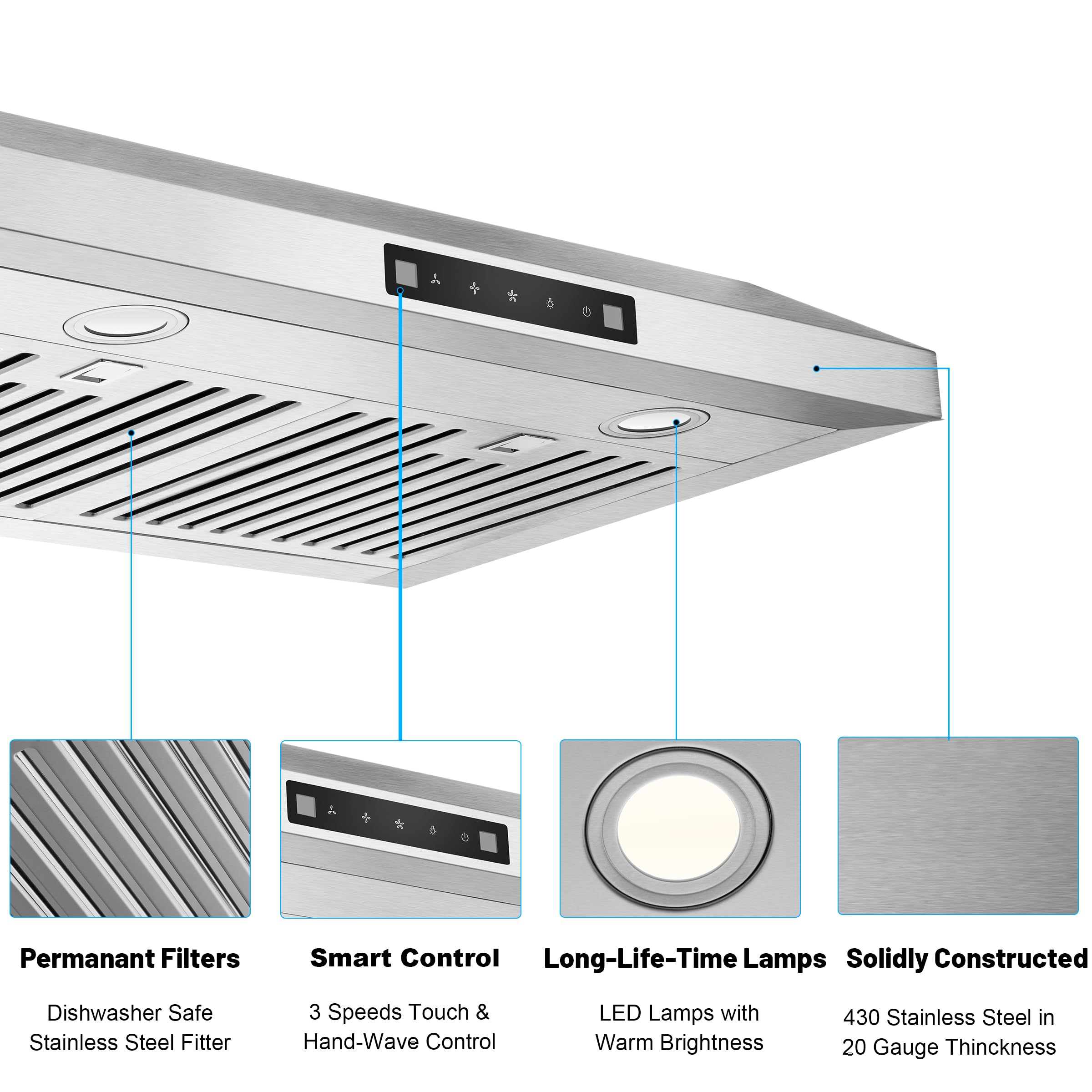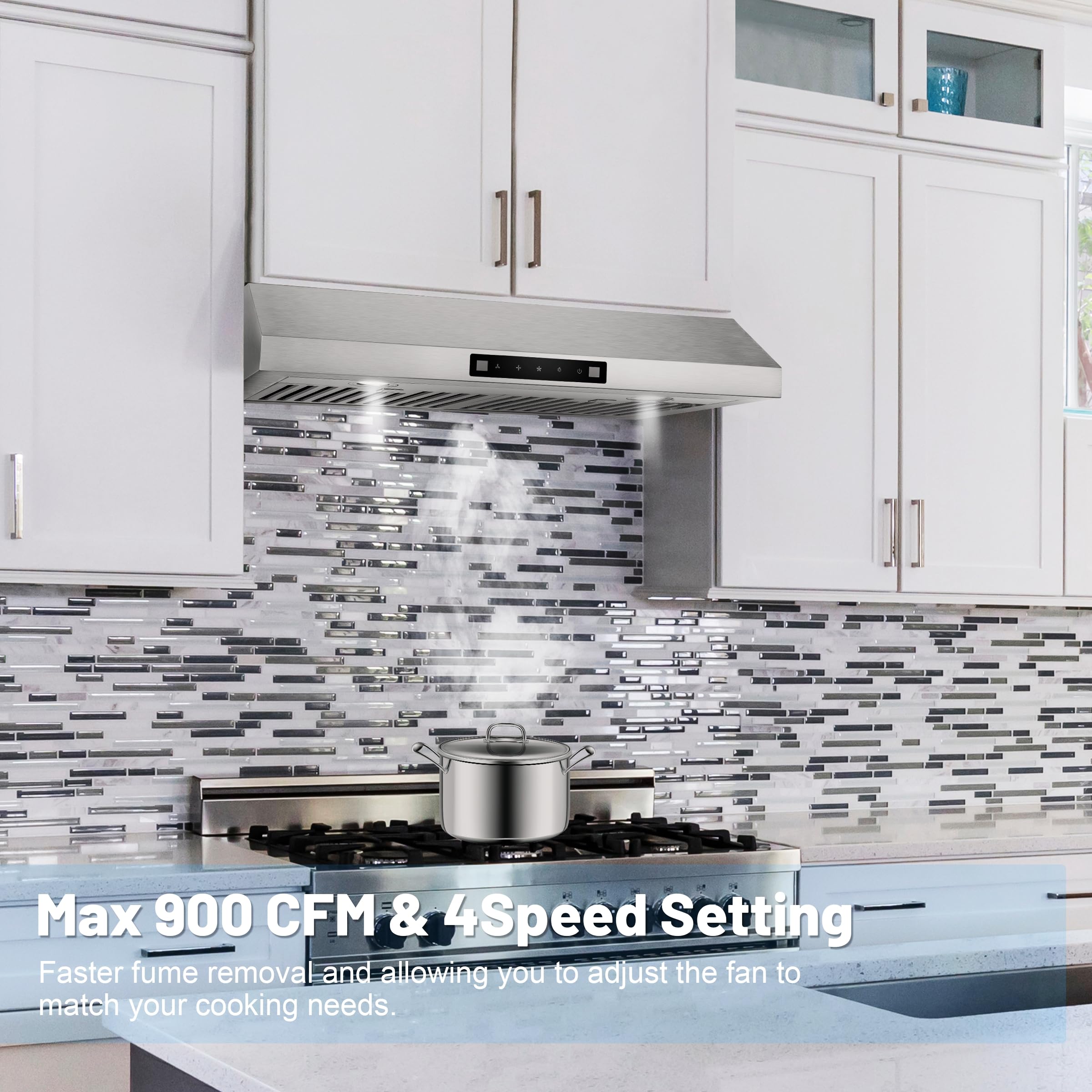 POWERFUL YET QUIET -- Everkitch stainless steel range hood 30inch provides 3 speeds at low, medium, and 600CFM at high. The noise level is less than 61 dB at high speed. The motor system is equipped with durable copper motor giving strong enough air suction power to clear odor in kitchen.