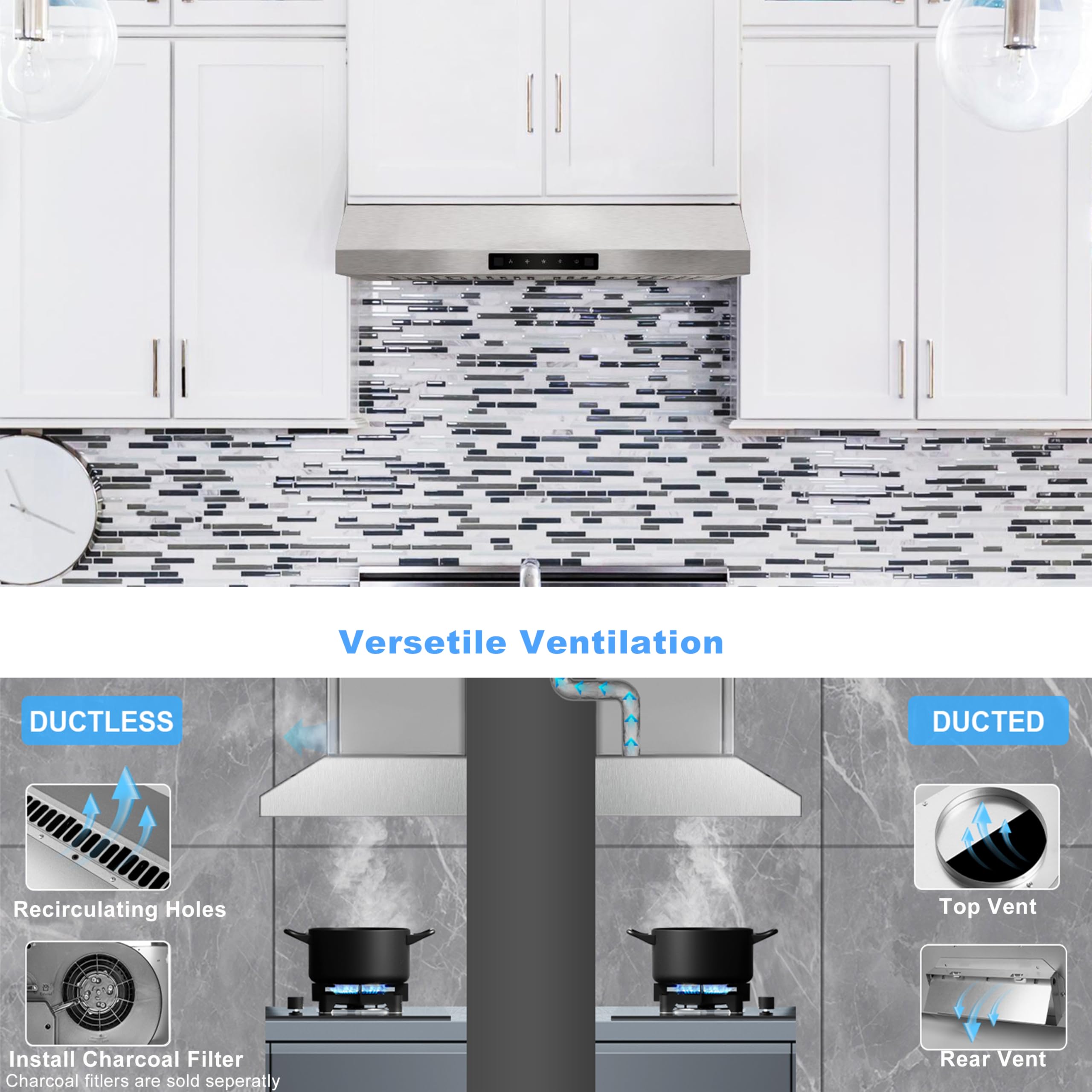 VERSETILE VENTILATION OPTIONS--This range hood under cabinet is convertible for ducted venting and ductless venting. Easy conversion process with all necessary hardware included.