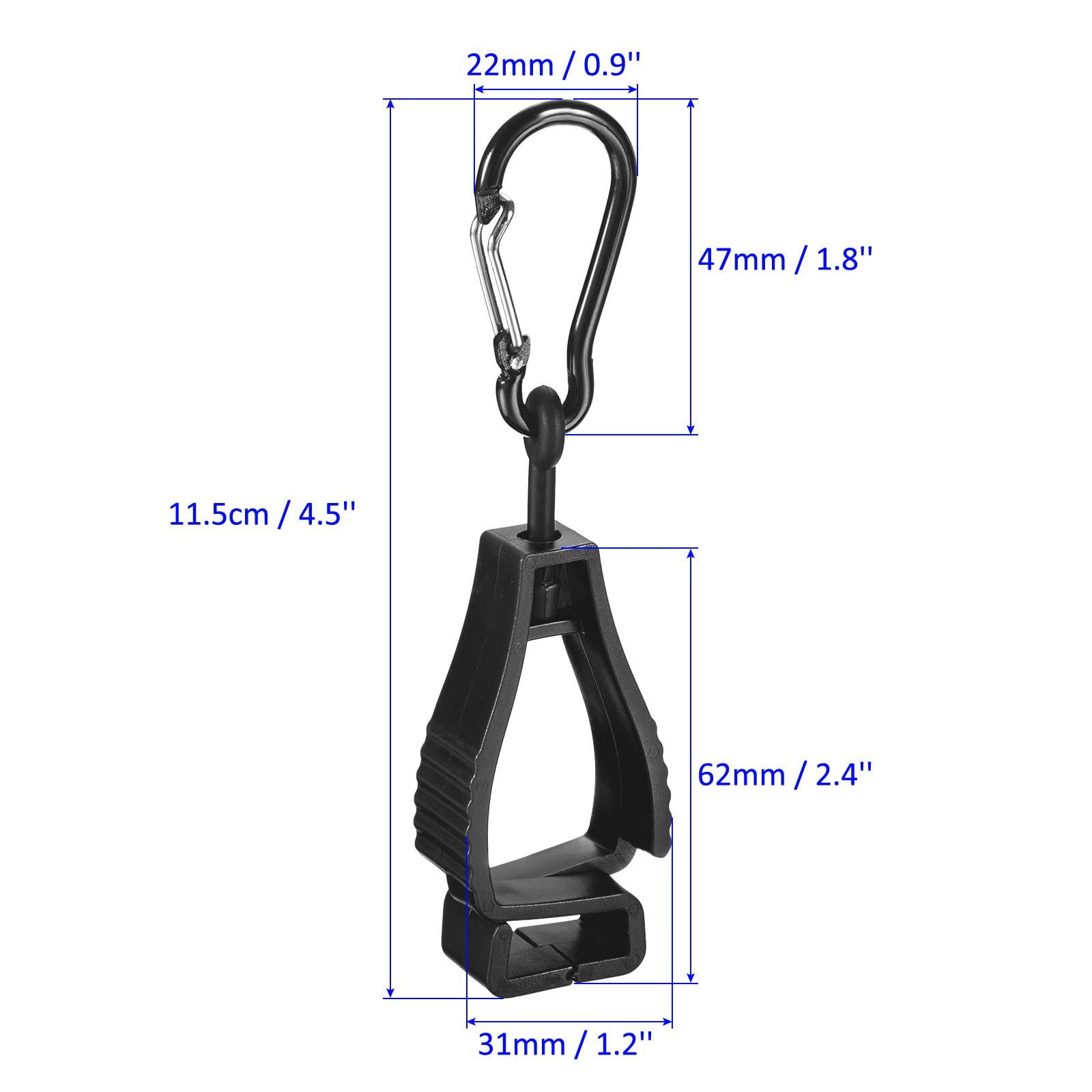 PACKAGE INCLUDE: 2 Pack Glove Clips, Metal Clip Size 47 x 23mm / 1.8 x 0.9'', Plastic Clip Size: 62 x 31mm / 2.4 x 1.2'', 11.5cm / 4.5" in overall length