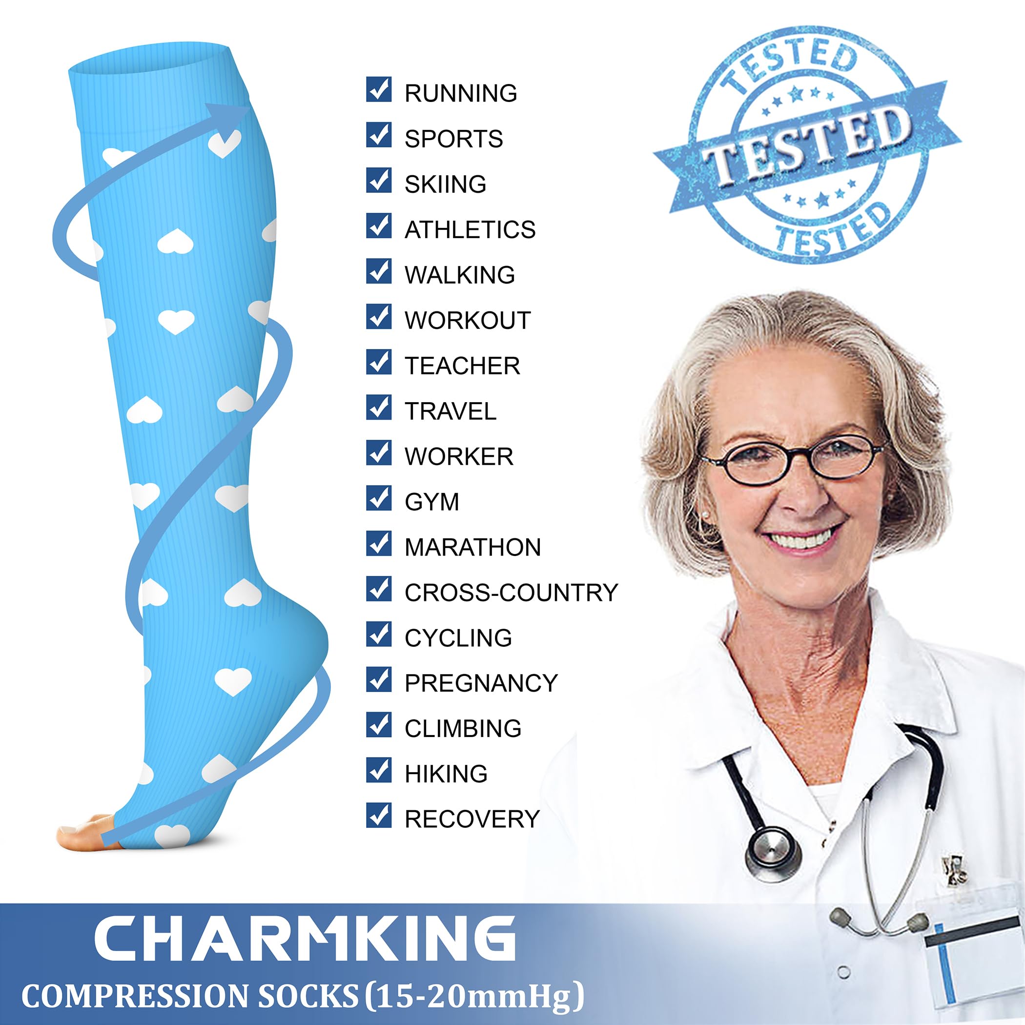 EFFECTIVE - Our compression socks (15-20 mmHg) are highly recommended by preferred by trainers. These are designed to promote blood circulation and oxygen flow preventing fatigue and helps in muscle recovery. Whether you are an athlete, teacher, flight crew, receptionist, office worker, pregnant, nurturing mother, elderly, our socks are universally suitable for all work.