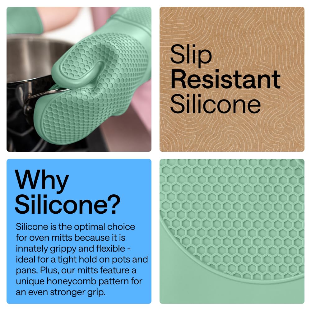 GET A BETTER GRIP: the best oven mitt pair; constructed of durable silicone, mitts are naturally slip resistant, helping you to get the best grip while you cook; unique textured honeycomb pattern helps you hold tight to pans, pots and baking sheets without hindering your natural grip