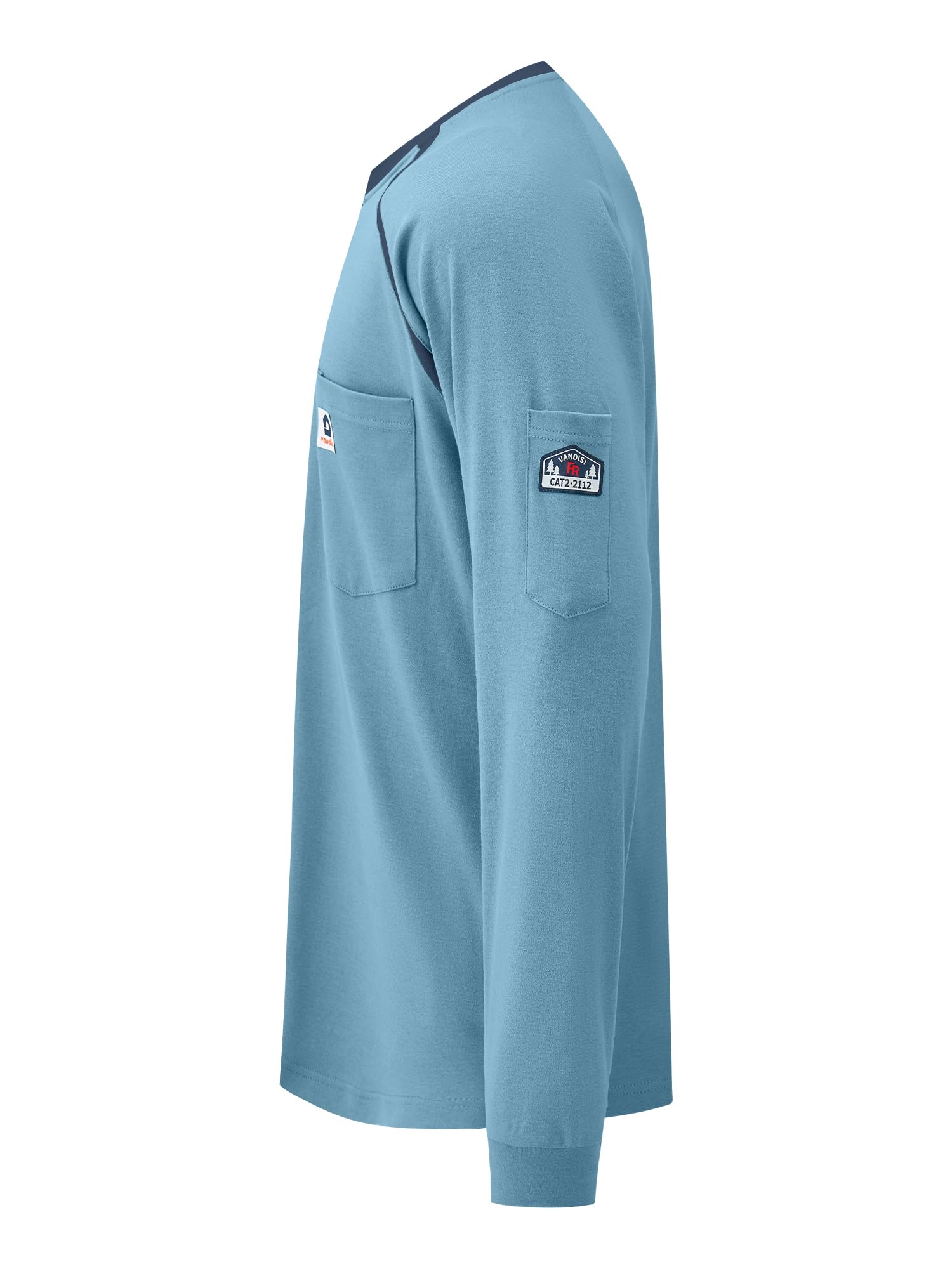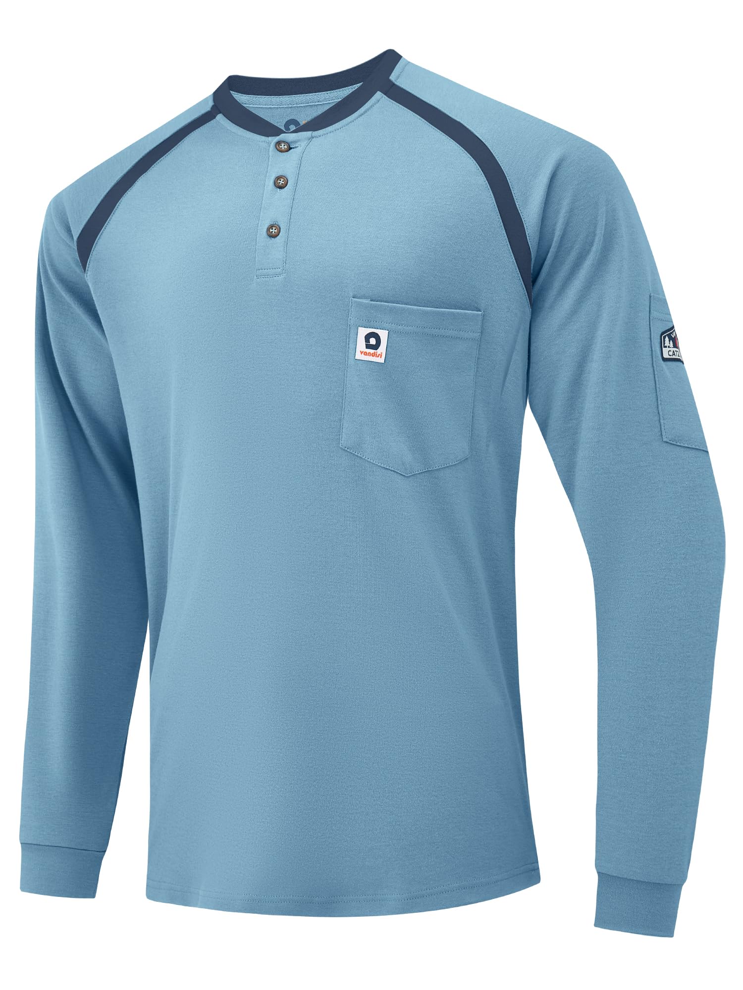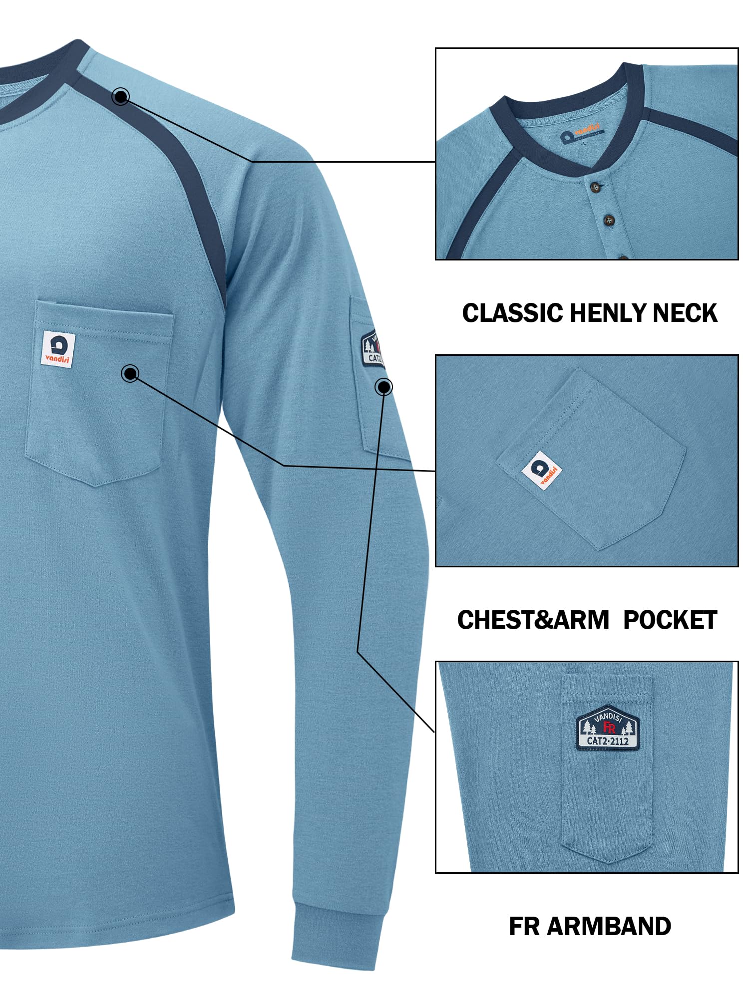 【Humanized Design】The Vandisi CAT 2 FR shirt features high-density seams and thermal transfer labels neckline for a true comfort experience. Henry collar and rib knit cuffs, enhanced fabric durability and stretch provide ease of movement and longer-lasting wear. Raglan sleeves significantly improve the fit of the shirt, 1 left chest pocket and 1 sleeve pocket for great convenience!