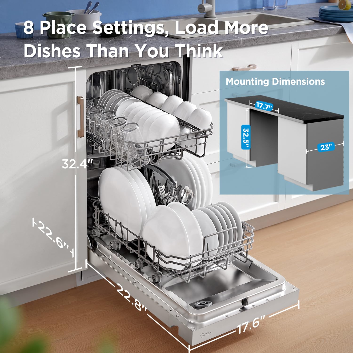 8 Place Settings Dishwasher : With dimensions of 22.6D x 17.6W x 32.4H with adjustable legs, this under sink dishwasher provides a spacious and flexible interior for maximum dishware loading.