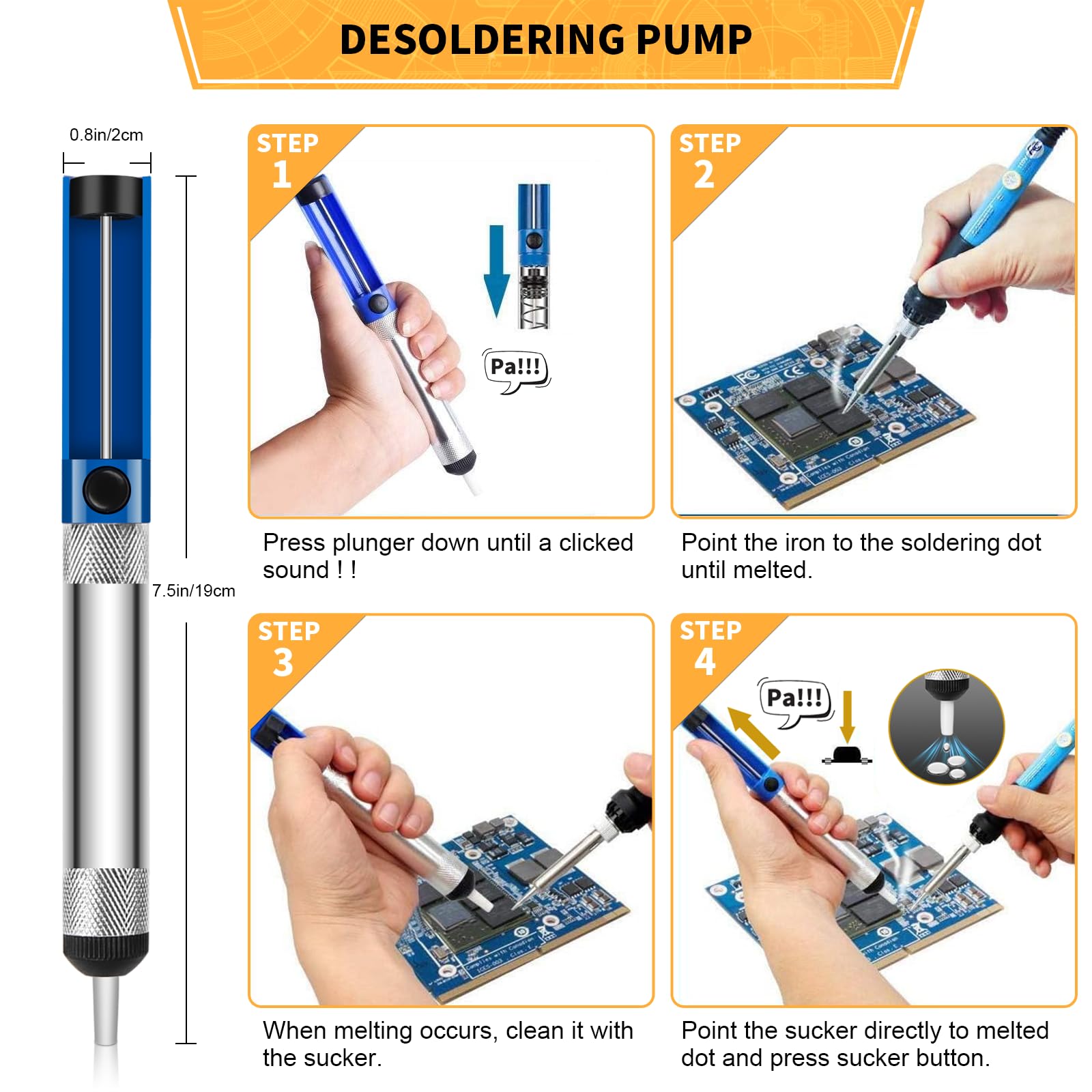 Efficient Desoldering Pump: Our desoldering pump features a rugged metal construction and a high-pressure vacuum tube with an aluminum body, enabling easy one-handed operation. This tool is perfect for removing solder from PCB through-hole solder joints, making it a must-have in your soldering iron kit for electronics