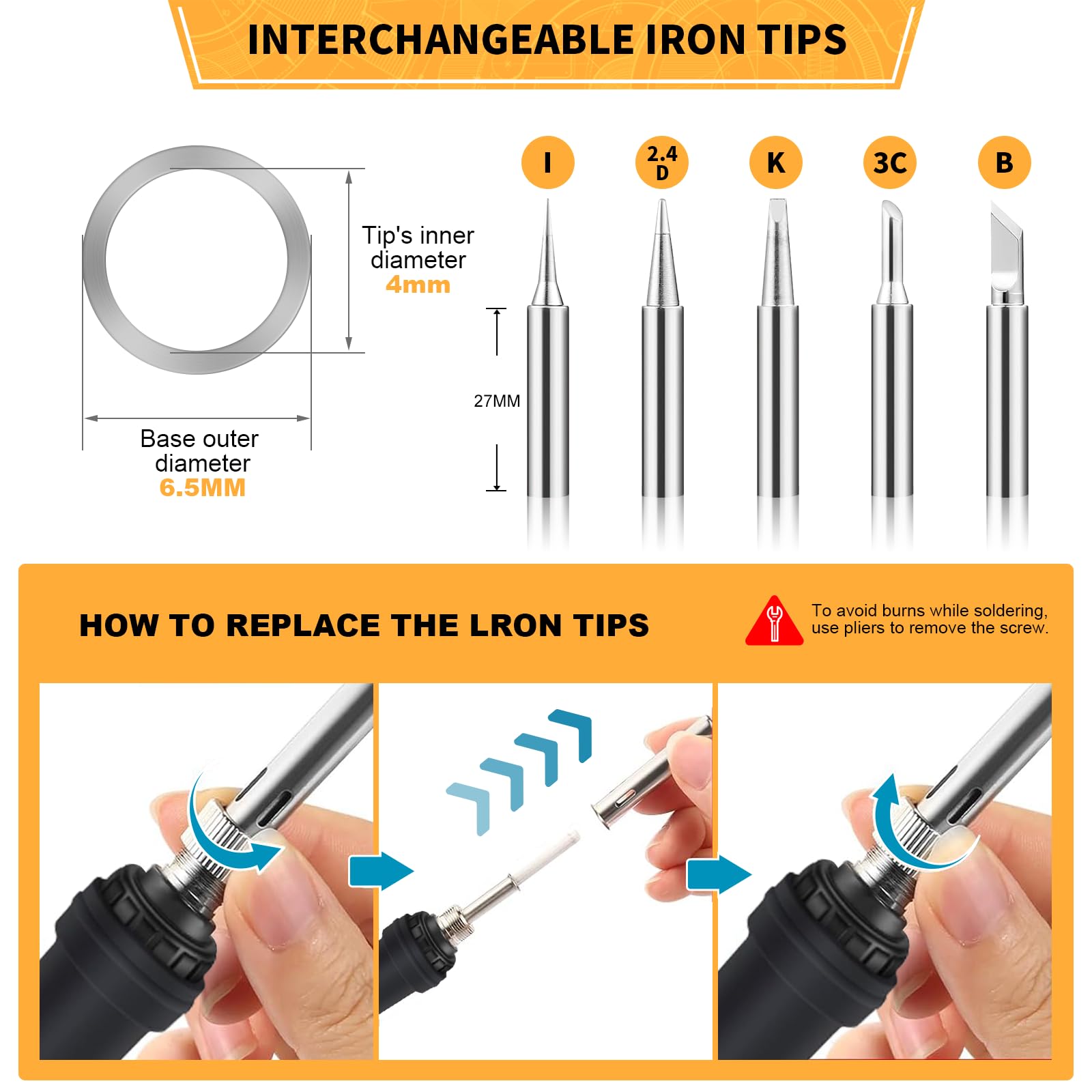 Unique Features of the Soldering Iron: Our soldering iron kit includes a professional-grade soldering iron with five interchangeable tips. Designed for durability, it features a heat and impact-resistant screw thread to keep the iron head securely in place. With adjustable temperatures ranging from 200°C to 450°C, it heats up quickly and performs exceptionally well for various tasks