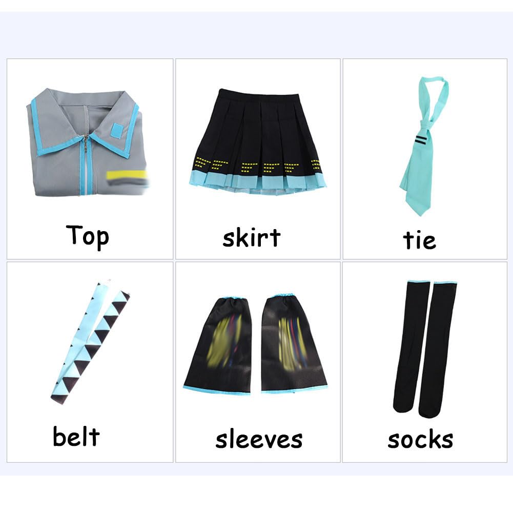 Includes: Top + skirt + sleeves + belt + tie + socks+wig.