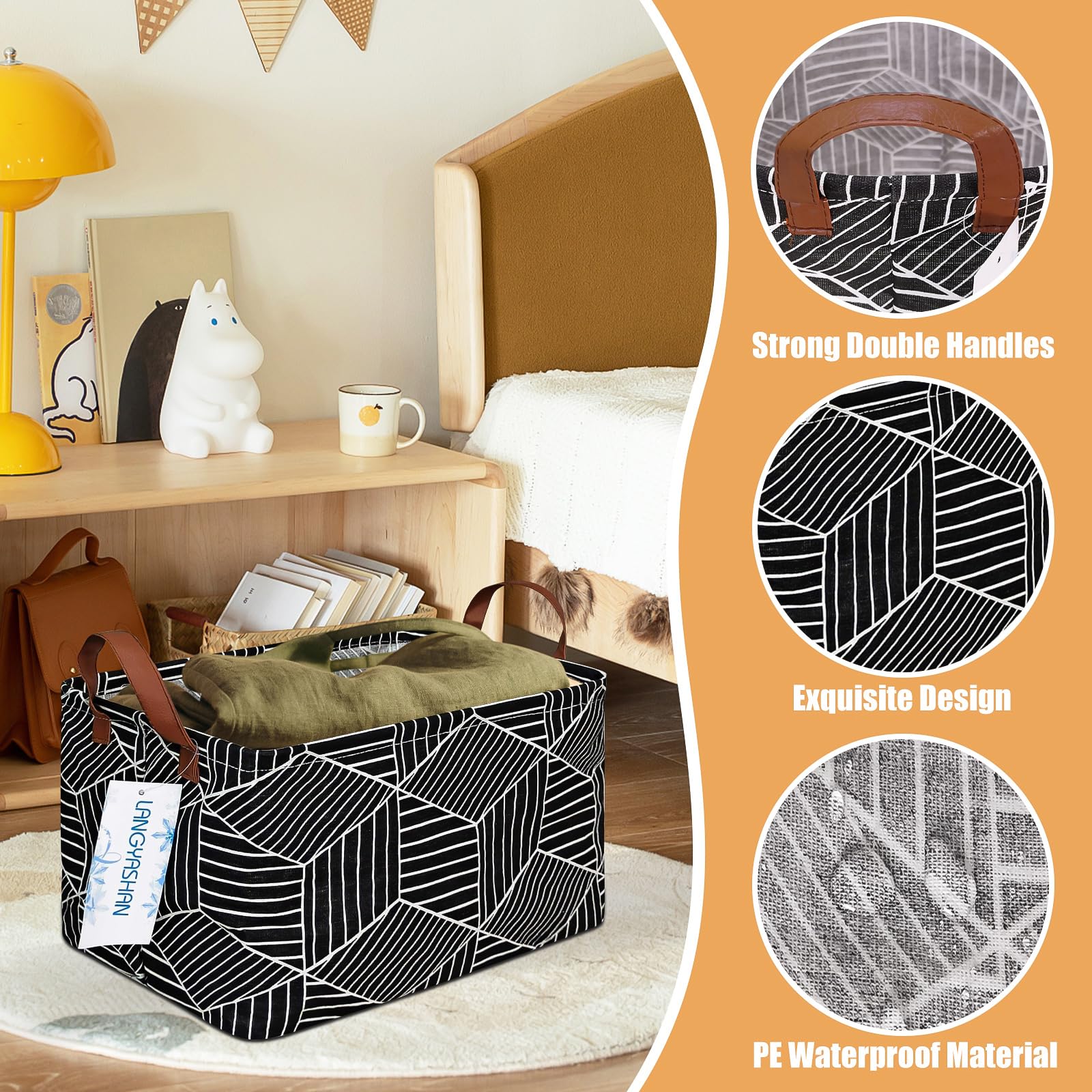 Material: Polyester canvas linen and PE environmental protection waterproof coating. This storage basket easy to stand and foldable, Waterproof PE coating inner, which to achieve the effect of moisture resistant.