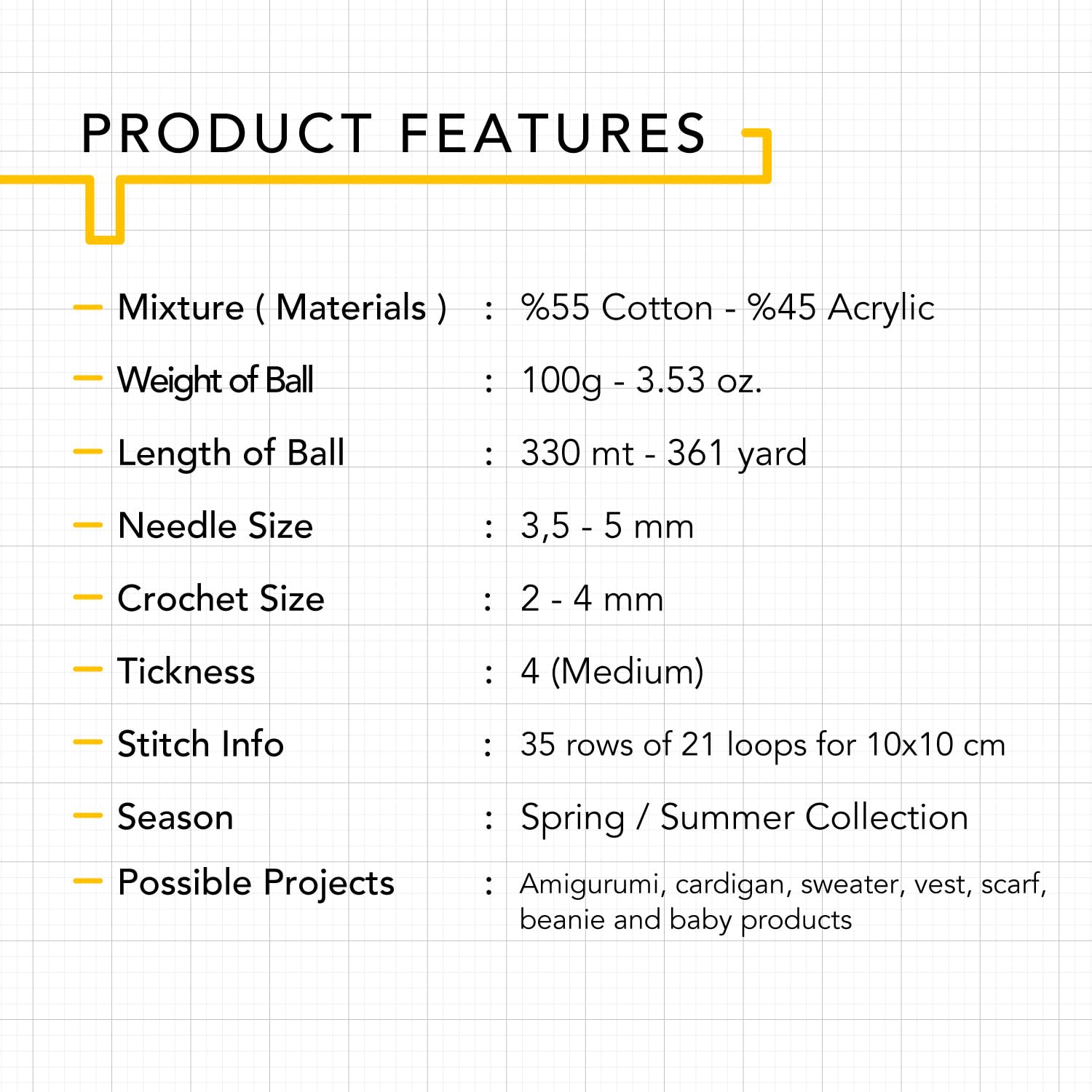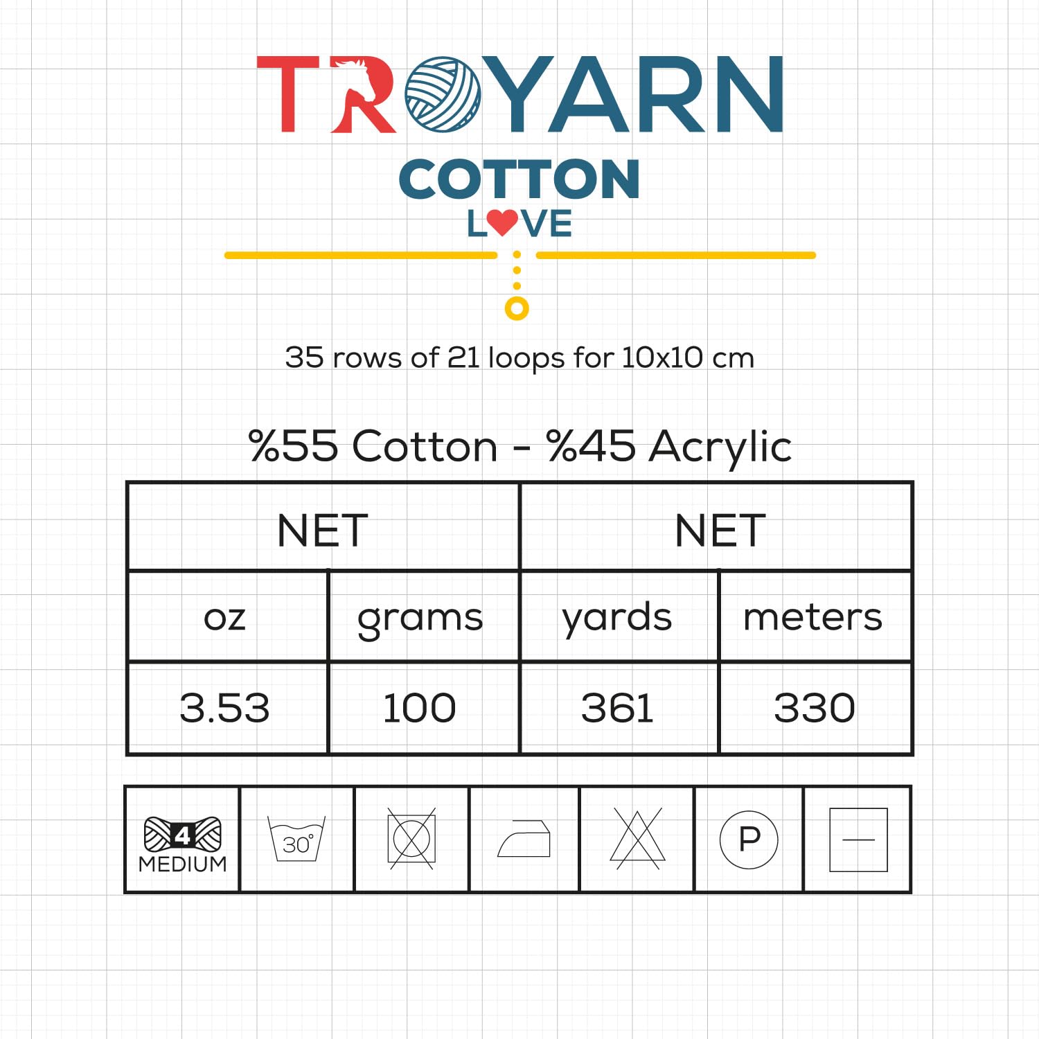 Troyarn Cotton Love yarn is made of 55% Cotton 45% Acrylic Yarn.Needle size US 4 - 8 or 3.5 - 5mm Hook size 2mm - 4mm (G).One Ball Weight: 3.52 (100g) ; Length: 360 yds (330m) and Tickness : Fine/Sport 2 Weight.Hand Washable at 30C or 86F, Dry Flat and clean, Do not Bleach, Do not Iron.Troyan Cotton Love suits well for creating All season clothes and accessories: dresses, blouses, skirts, bags, etc. Blankets, tablecloths, napkins made from Troyan Cotton Love yarn are also very beautiful. This cotton yarn is also very popular among knitting masters who create handmade knitted toys - amigurumi.
