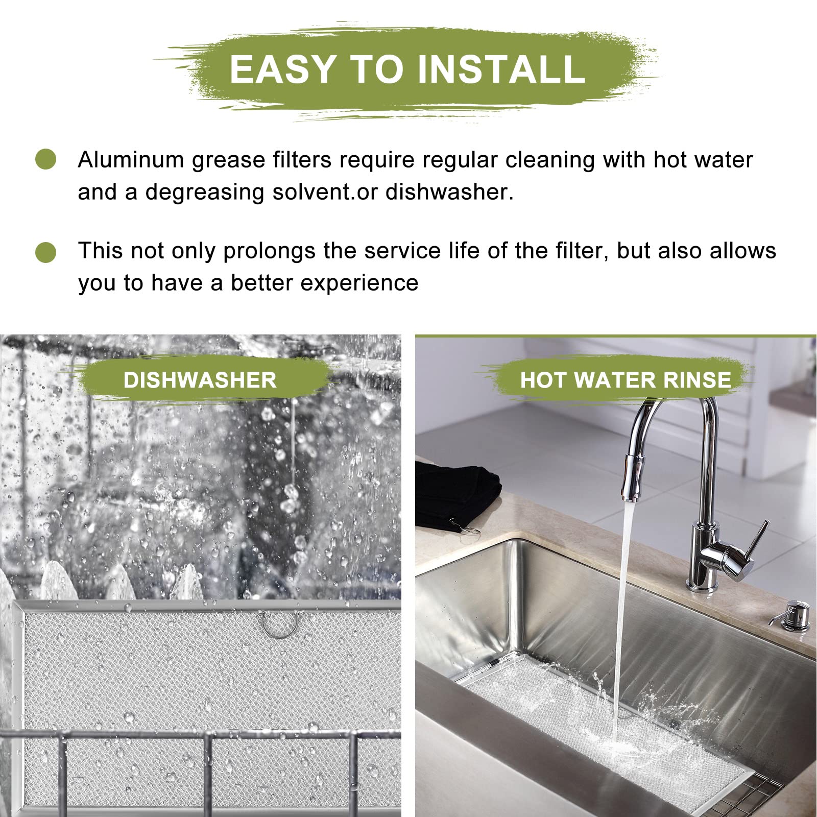 【Dishwasher Safe & Easy to Maintain】grease filter replacement is fully dishwasher safe or can be hand-washed. Soak in 50-60℃ warm water with baking soda/soap for 10 minutes, scrub gently, and rinse. Regular cleaning WP71002111 replacement filter extends the downdraft stove lifespan, reducing frequent replacements and saving you money