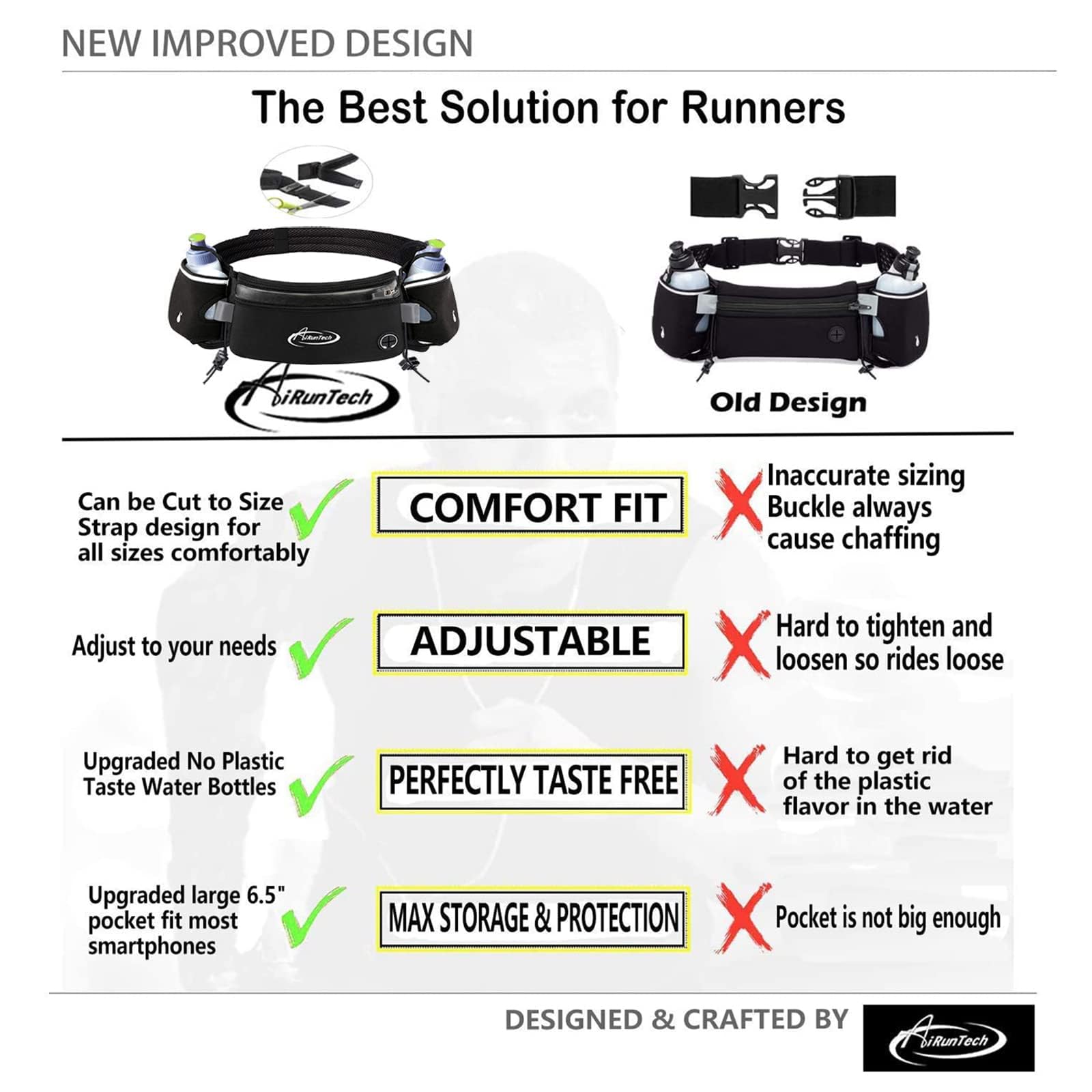 AiRunTech is a US brand focusing on products assisting to the people who are fond of running, cycling, swimming, snow skiing, and other outdoor activates etc. AiRunTech prioritizes on ensuring excellence in Quality, Eco-friendliness and utmost comfort. Organized by a young team, AiRunTech is committed to source premium quality products for you and keep improve the products. Our products are designed to help you enjoy sports with greater comfort, convenience, and style. STORAGE & PROTECTION Fit for Apple iPhone series,Huawei, Samsung Galaxy Note,Sony and most smartphones.The running belt is also perfect for credit cards, ID, keys, paper towel, bars choc, energy gel packs, running accessories, etc.With zipper closure,keeps your valuable belongings secure inside.Keep your hands free and avoid pickpockets while on the go. FRICTION-FREE COMFORT AiRunTech running water belt is made of high quality, lightweight,durable,soft Neoprene material, with anti-slip design, adjustable hook&loop tape strap waistband allows for a snug fit that stays in place without bouncing or chafing during use. Easy for buckling and comfortable for wearing. EXCLUSIVE HEADPHONE HOLE How can there be no music during exercise, the opening for earphone wire let you can enjoy music even when the running bag is closed. FULLY ADJUSTABLE long enough to accommodate plus size, but is also easily cut for people with slimmer builds, give you the ultimate freedom of movement and comfort, personalized fit for waist from18 - 51.2 inches(46cm-130cm) . VERSATILITY & SAFETY Two 10zo/300ml BPA-free water bottles allow you to easy access to hydration and nutrition.Design of 2 removable race bib strap toggles can hold your race number for triathlons, marathons or running race. Reflective tabs on the front of the pocket are for high visibility, keeping you more safely when running or walking.