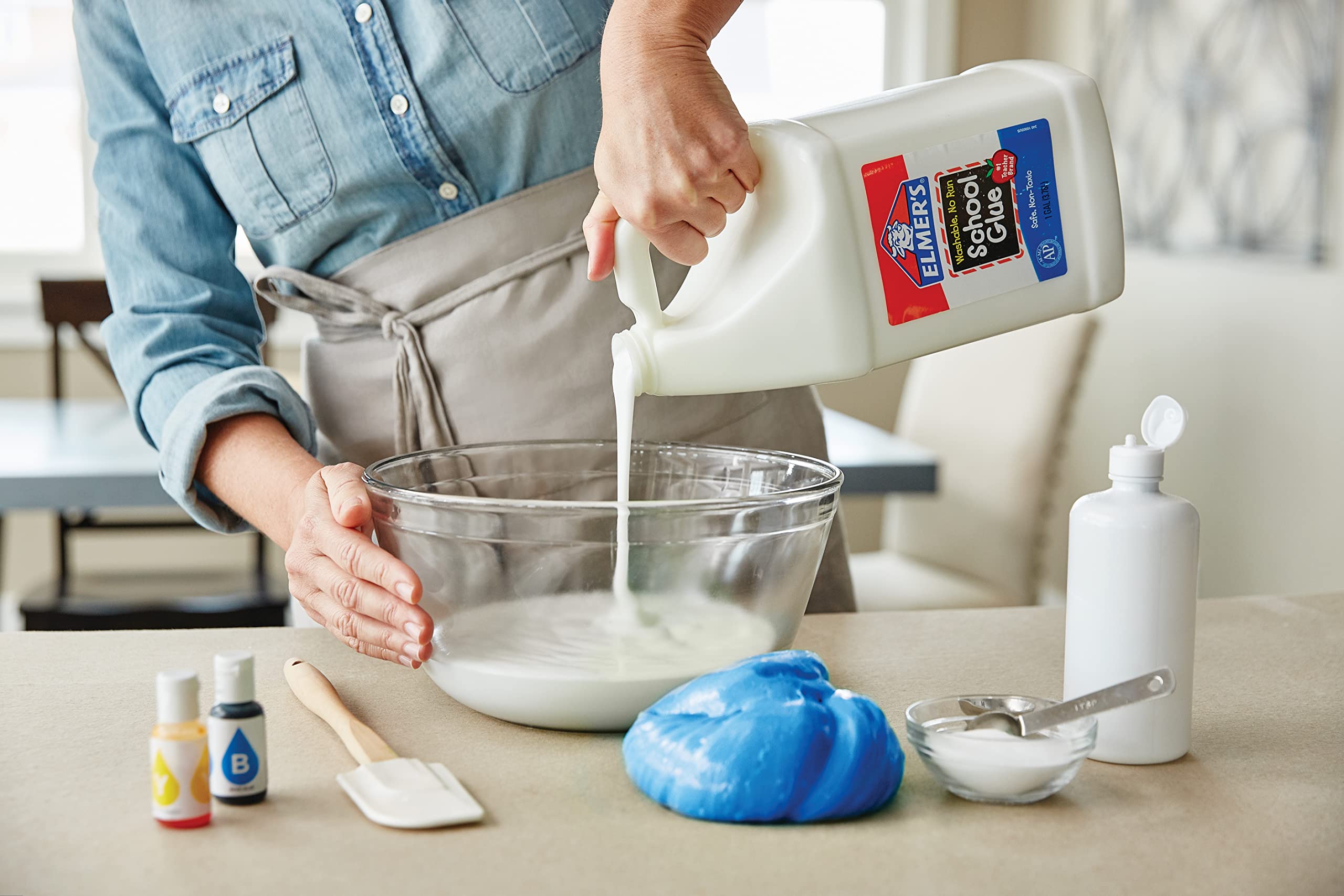 Product Description Attach items to paper, wood, cloth, pottery, and more with the non-toxic adhesive of Elmer's Washable School Glue. Specially formulated to be washable and easy to use, Elmer's School Glue perfect for school projects and home arts and crafts. Elmer’s School Glue is adjustable before setting and does not run, delivering reliable results with every use. You can also use your liquid glue to create glue slime! Set Contains: 1-gallon bottle of Elmer's Clear Washable School Glue