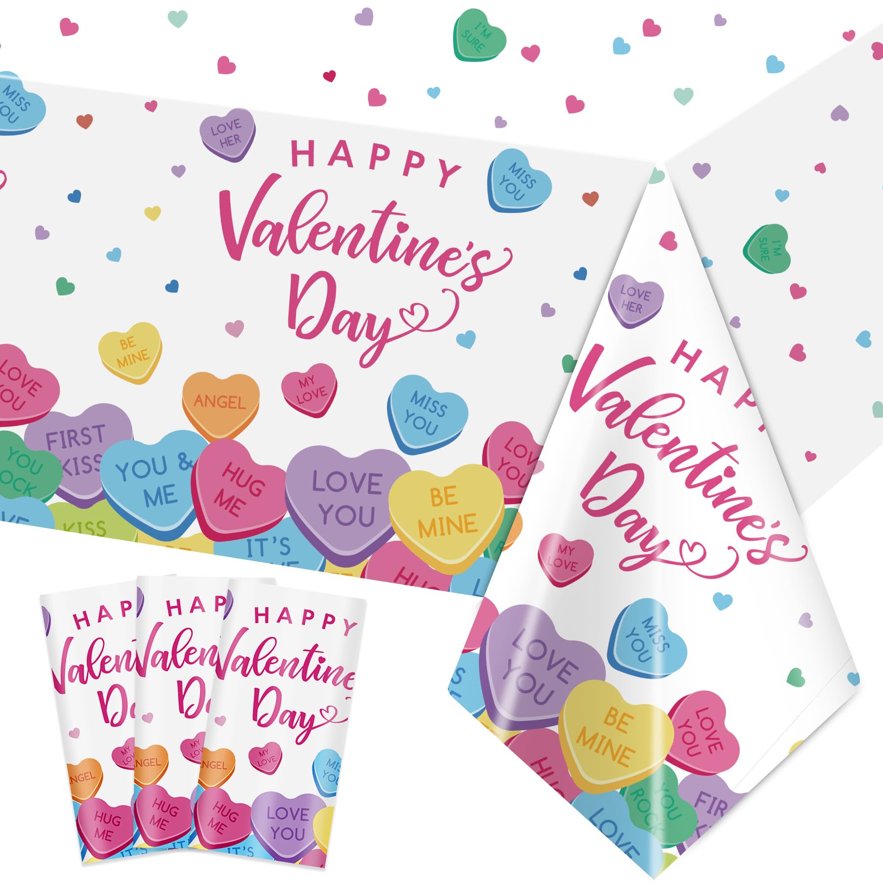 Package Includes:3 x valentines day tablecloths Features: 1. Tabletop protection 2. Party decoration 3. Easy cleanup Size: 54 x 108 inches Material: Plastic Remarks: 1. Please allow slight deviation in size. 2. Colors may vary slightly due to different screen displays. 3. Plastic odor may exist, please ventilate upon receipt.