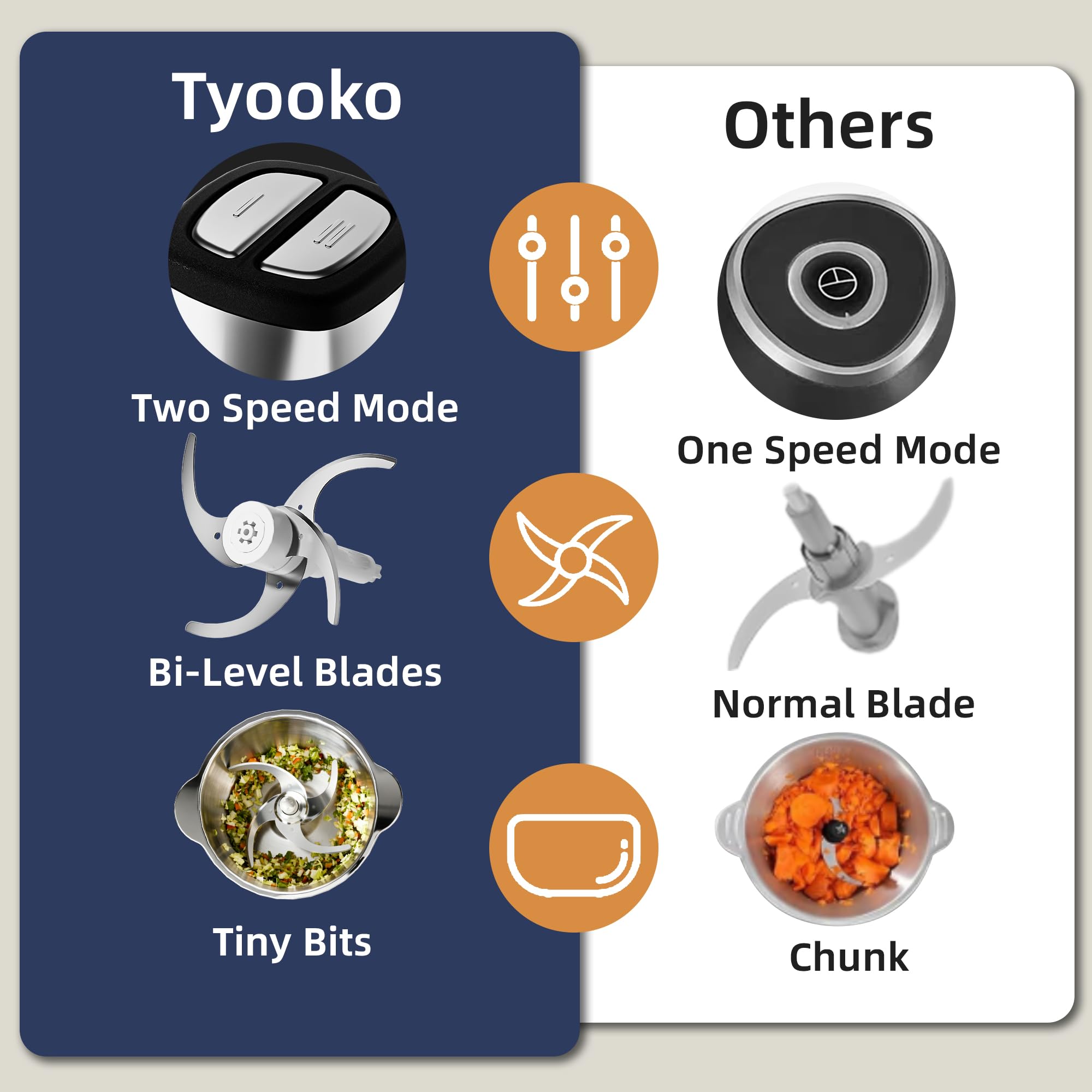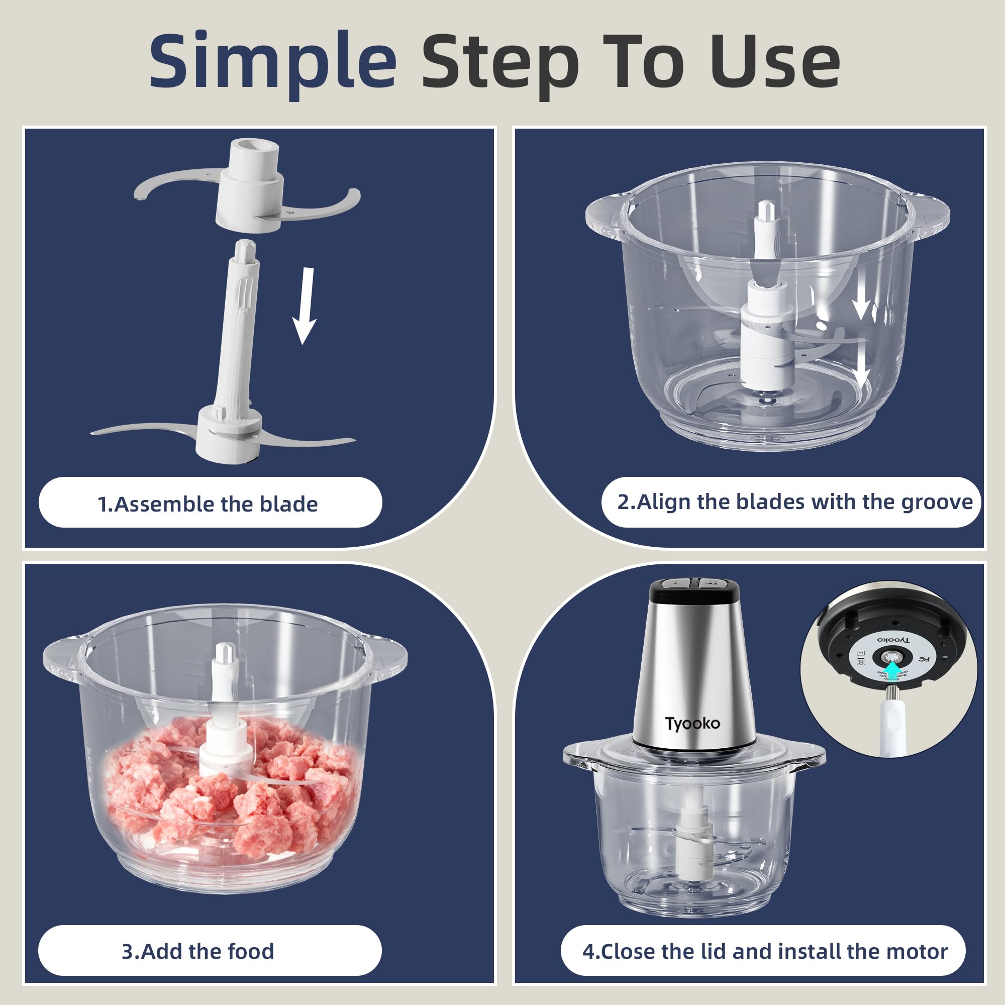 【Powerful & Safe】This small food processor comes with full-copper motor to ensure that hard foods also can be processed completely into tiny bits. Food-Grade materials certified BPA-free ensuring safe and healthy food processing for your family. Additionally, this electric chopper built-in with safety lock, align the motor shaft core with the blade interface, motor work only when the arrow of the motor align to the lid arrow. Blades halt instantly when the motor is disengaged