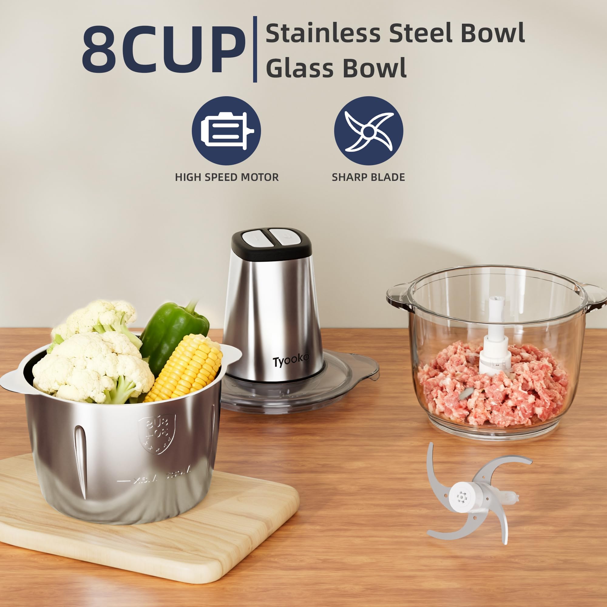 【Two Bowls】This Food chopper with container contains with two different materials bowls accessories, 8 cup stainless steel bowl and 8 cup glass bowl. You can process the meat and vegetables separately to avoid confusion between bowls for different uses. This meat chopper for ground beef can make your food process healthier and more hygienic