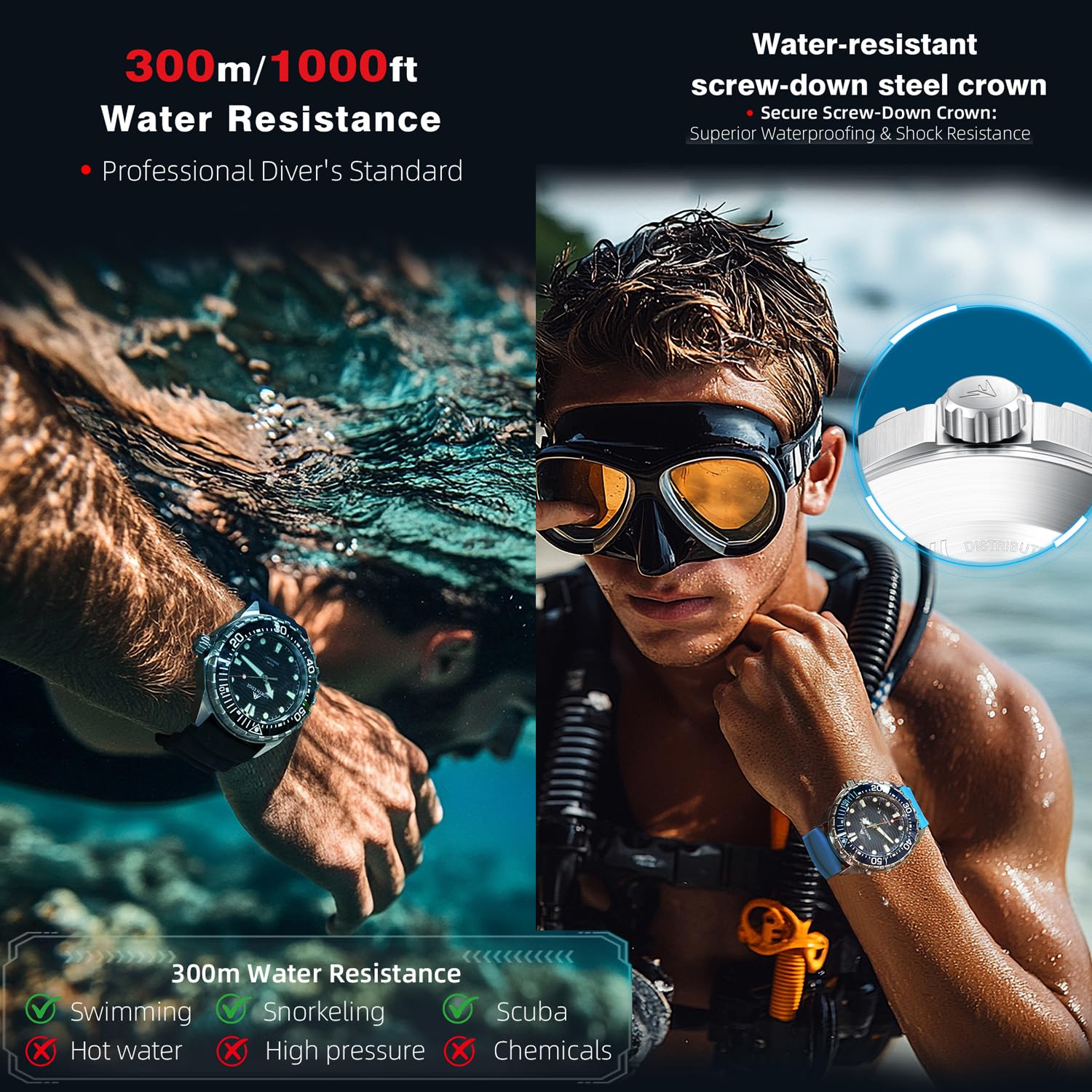 300M (1000FT) Professional Dive Watch – Designed for serious divers, swimming, snorkeling, and water sports. Superior water resistance