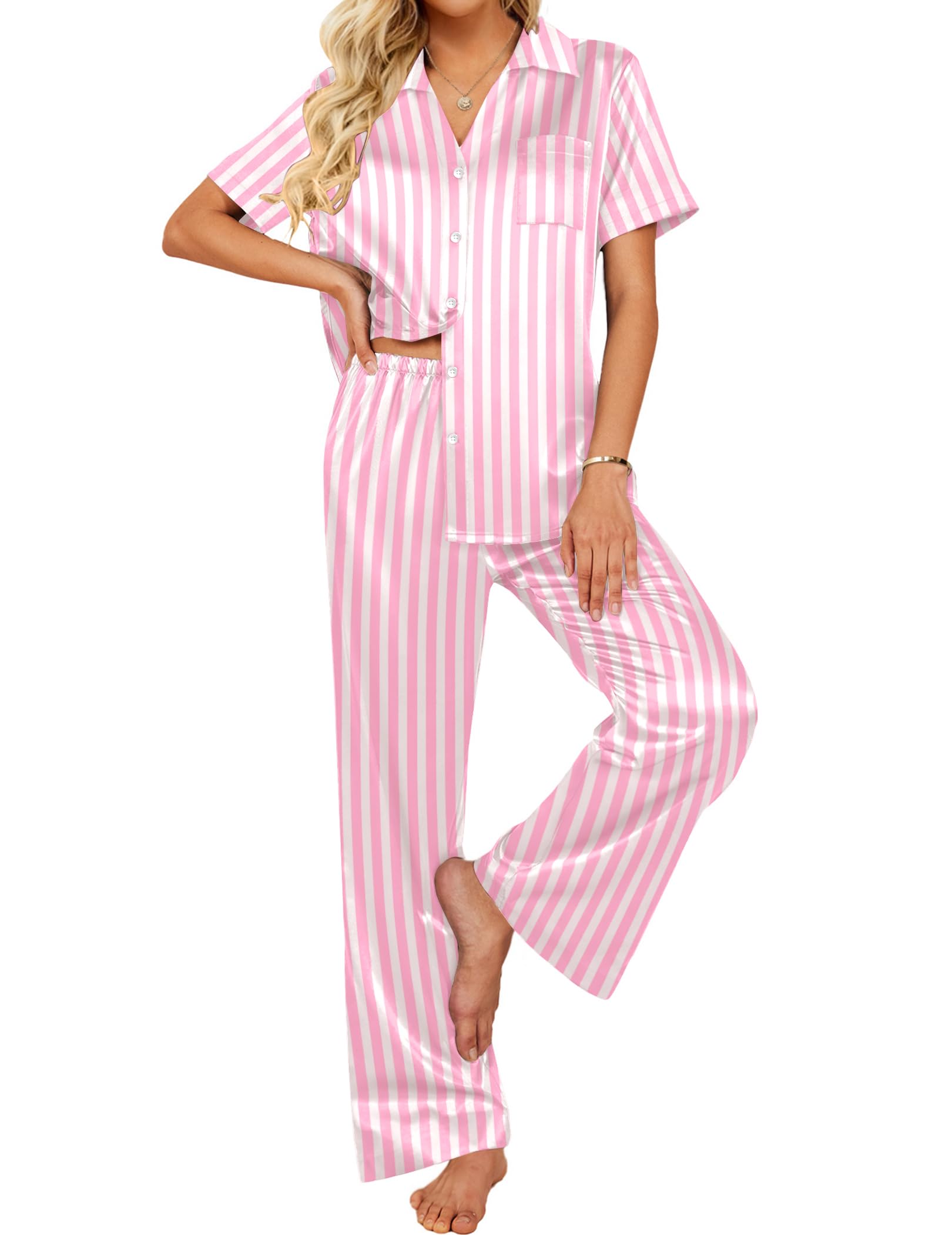 Material: Silk pajama set is made of premium lightweight, breathable and skin-friendly fabric, just like wrapped in a cloud, helping you have a sound sleep