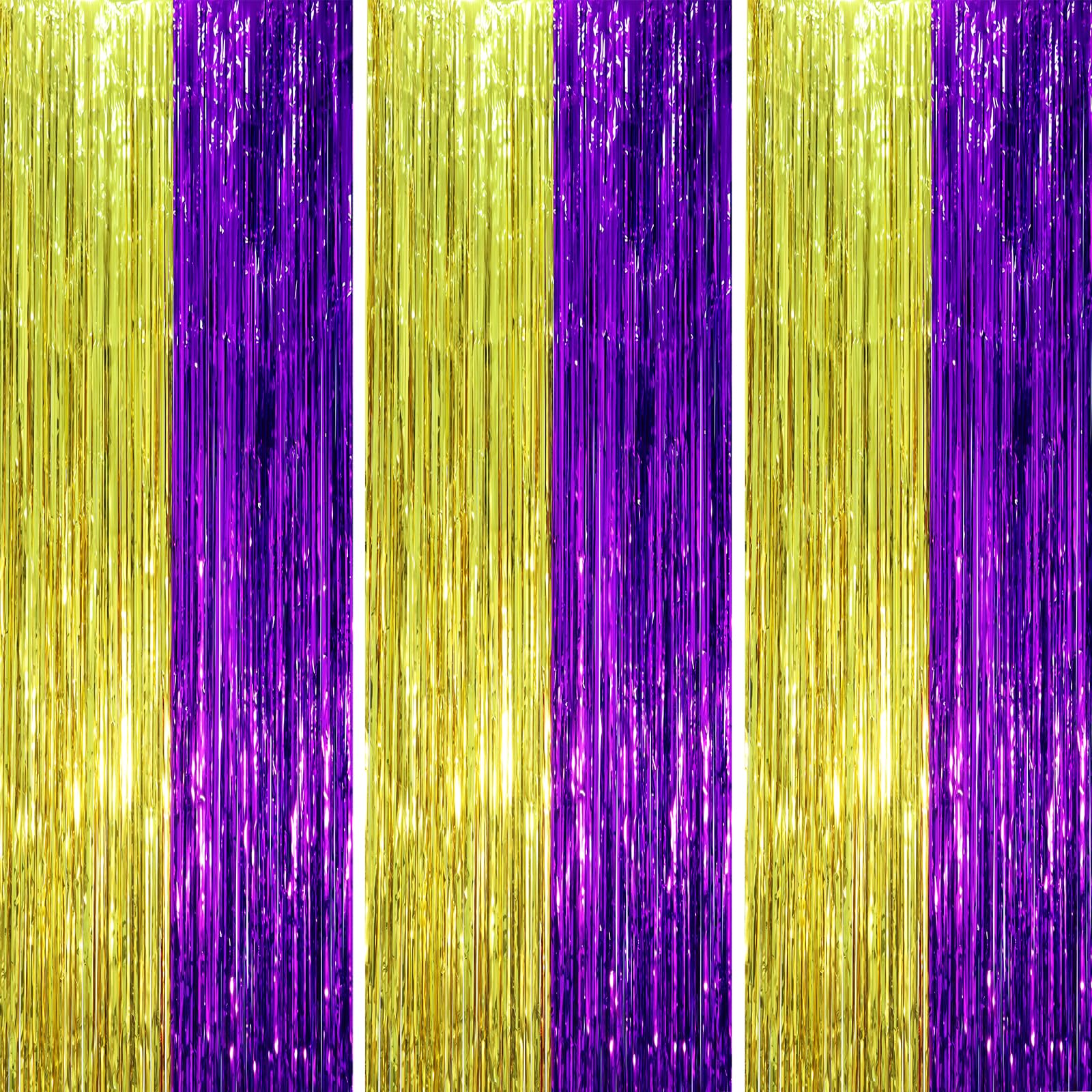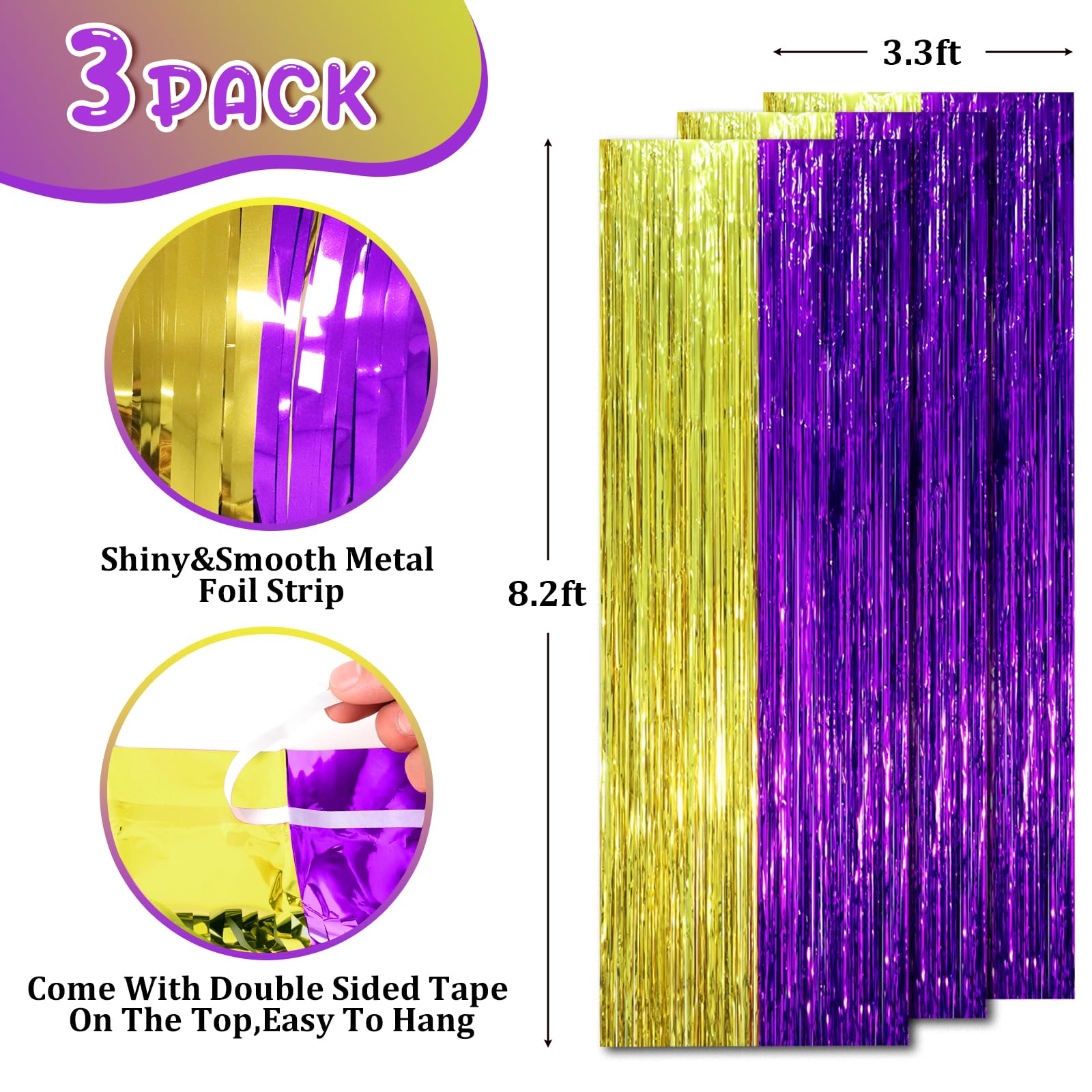 Package Included: 3 packs of purple gold foil fringe curtains, the size of the foil curtain is 3.3*8.2ft. It's long enough to fit any occasion