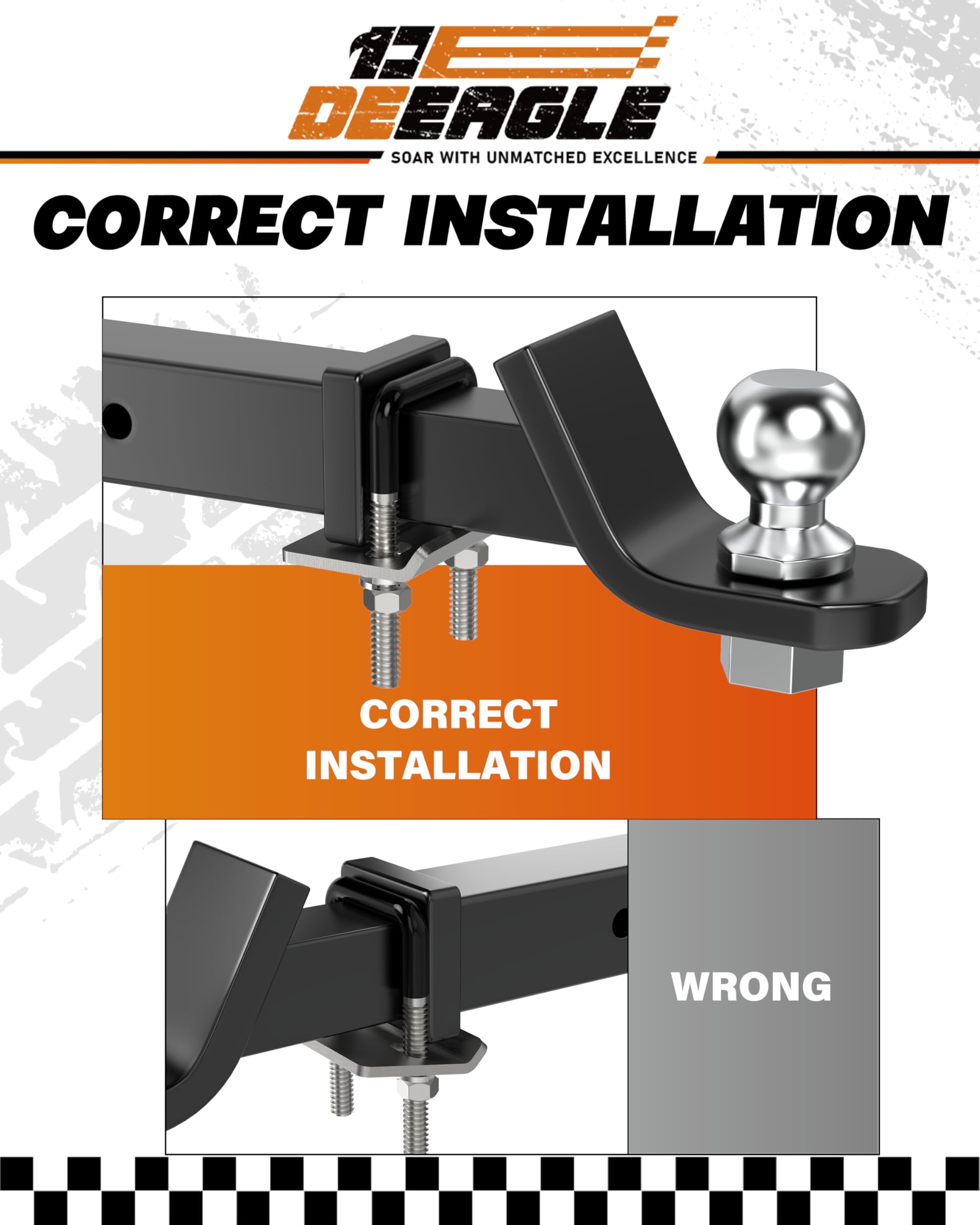 Easy to Install. Insert the tube, lock them directly by U-bolt and plate. Fasten then with our spring washers, flat washers. Rotate the bolt to ensure the tightener is working. If the hitch is low, and there is a risk for U-Bolt to scrap ground, lock the tightener from the bottom.