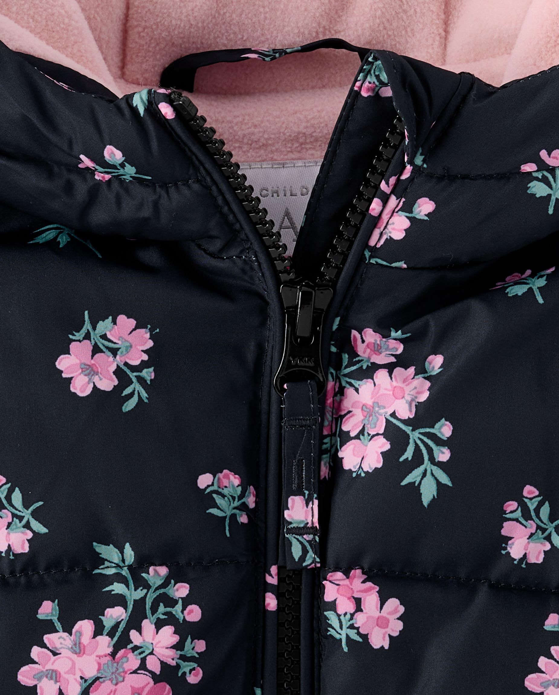 FEATURES: Water & wind-resistant, zip-front, front welt pockets, allover quilting & print; microfleece hood, body & pocket lining