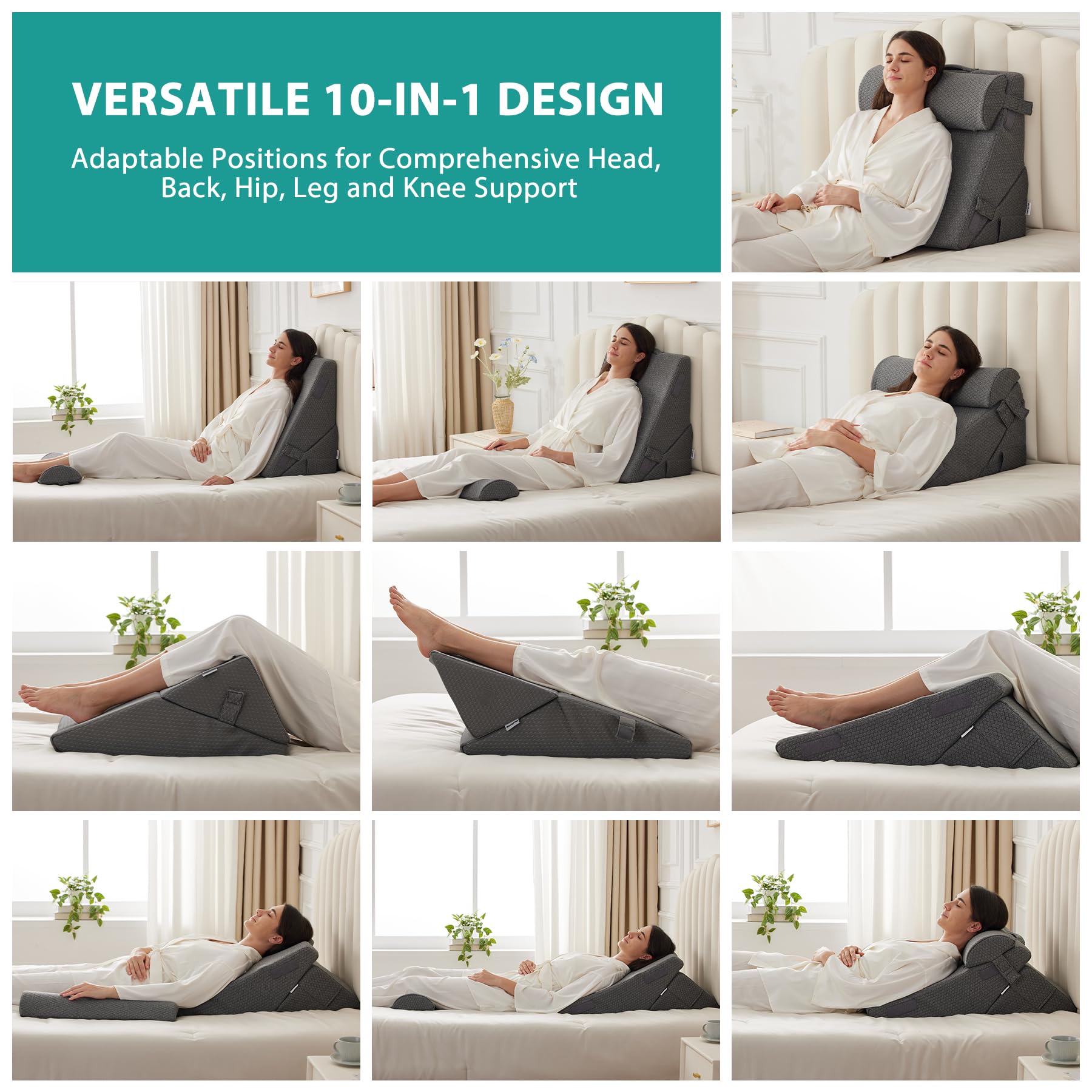 Adjustable 10-in-1 Design: Bedluxe's bed wedge pillow set offers a dynamic 10-in-1 adjustable design. Its ergonomic design supports various uses β from elevated back support for sleeping, reading or working, to a gentle slope for sleep, easing snoring, post-surgery discomfort, acid reflux, and improving blood circulation as a leg elevation pillow.