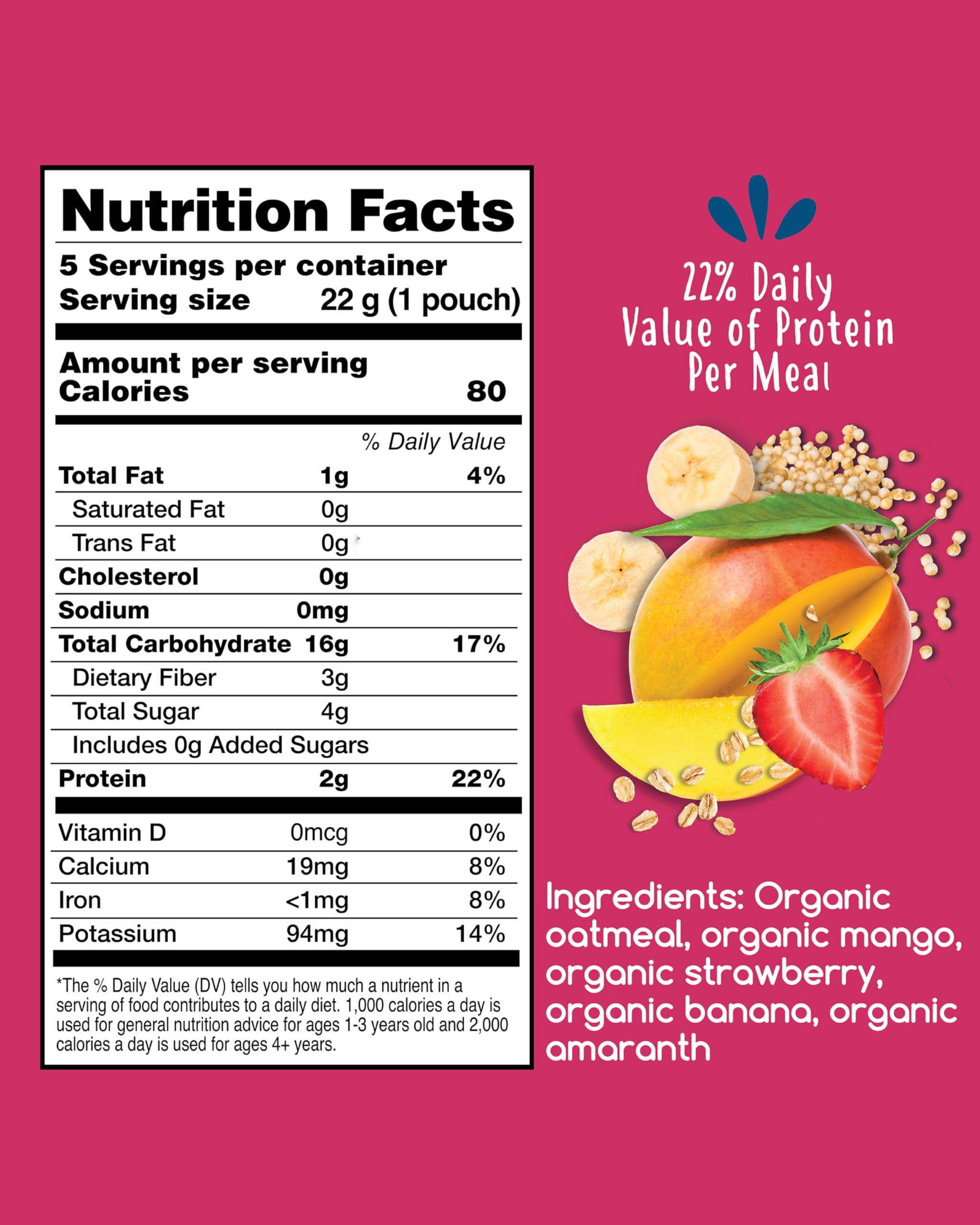 SIMPLE INGREDIENTS: We use only the best whole ingredients in our baby pouches and baby snacks to bring the benefits of fresh, homemade food directly to your table. Ancient Grain is made from organic oats, mango, strawberry, banana and amaranth.