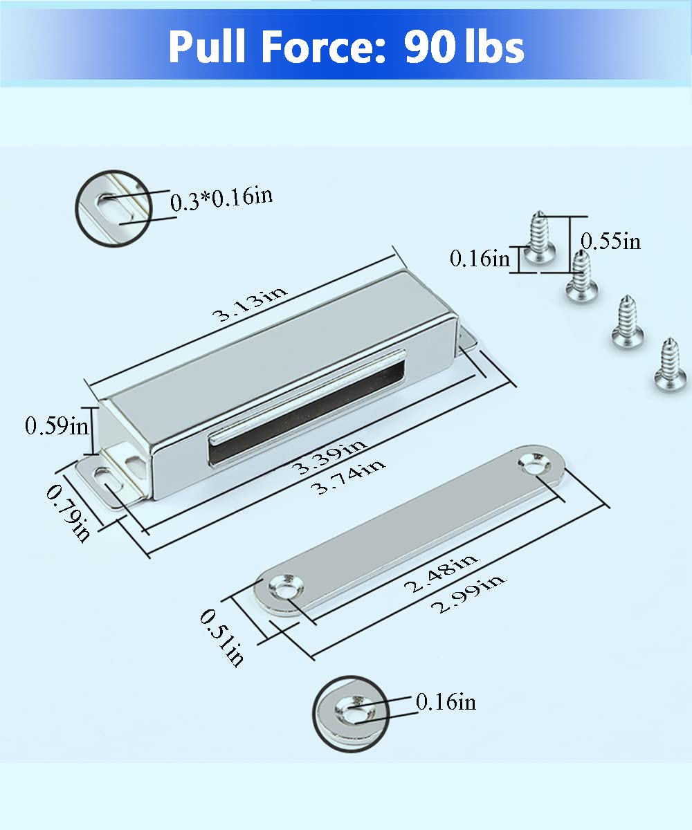 【90lb Pull Force High Magnetic】Secure closure rated for up to 90 lbs. of pull strength. Super strong magnet and high quality steel strike plate keeps doors securely closed.