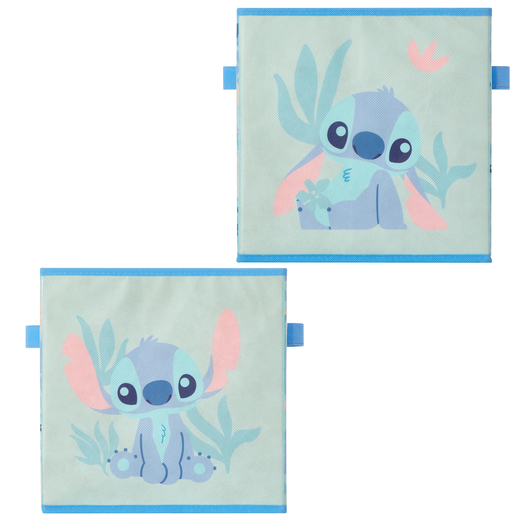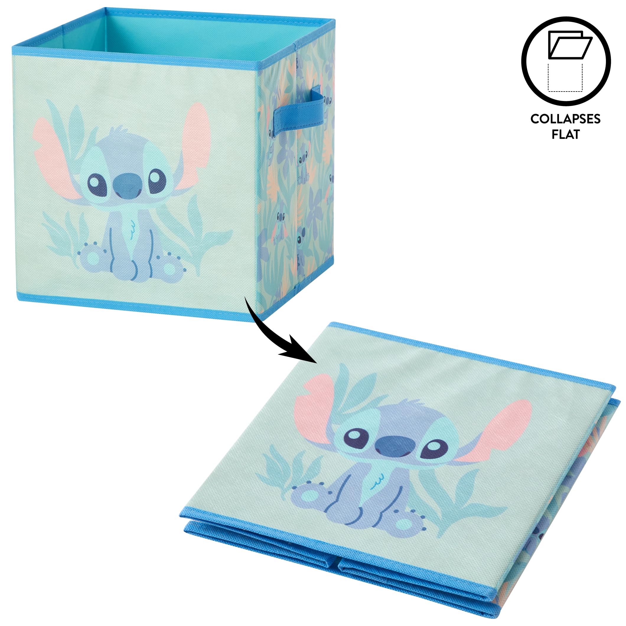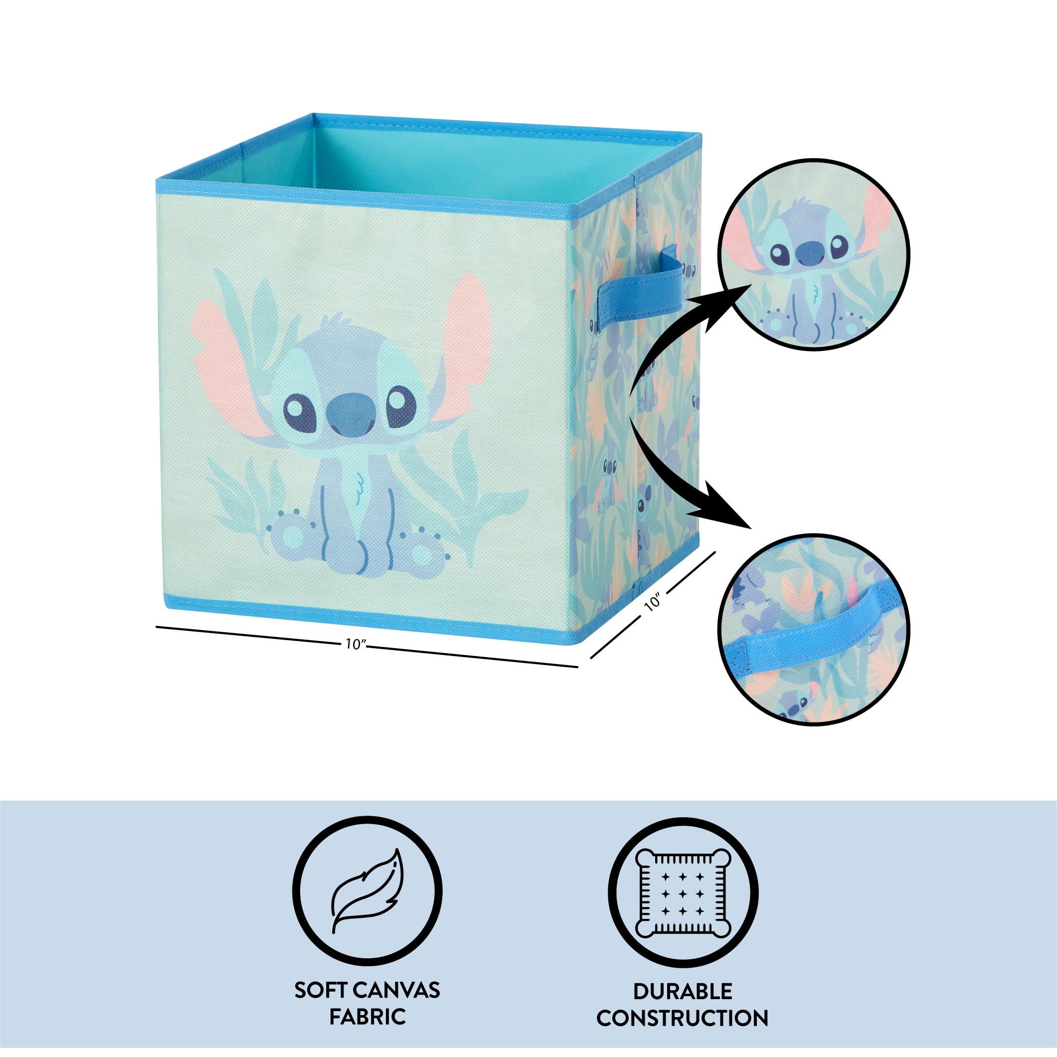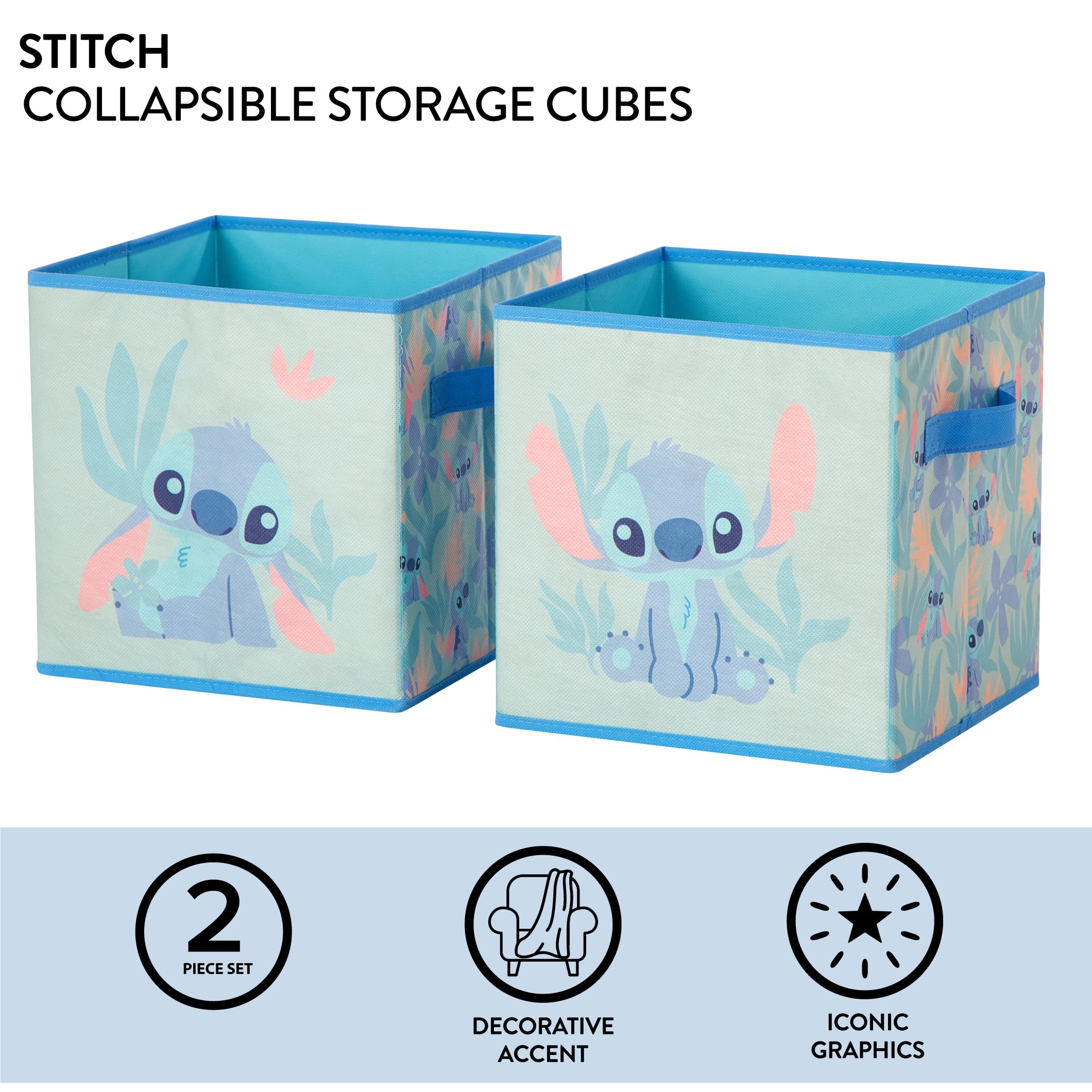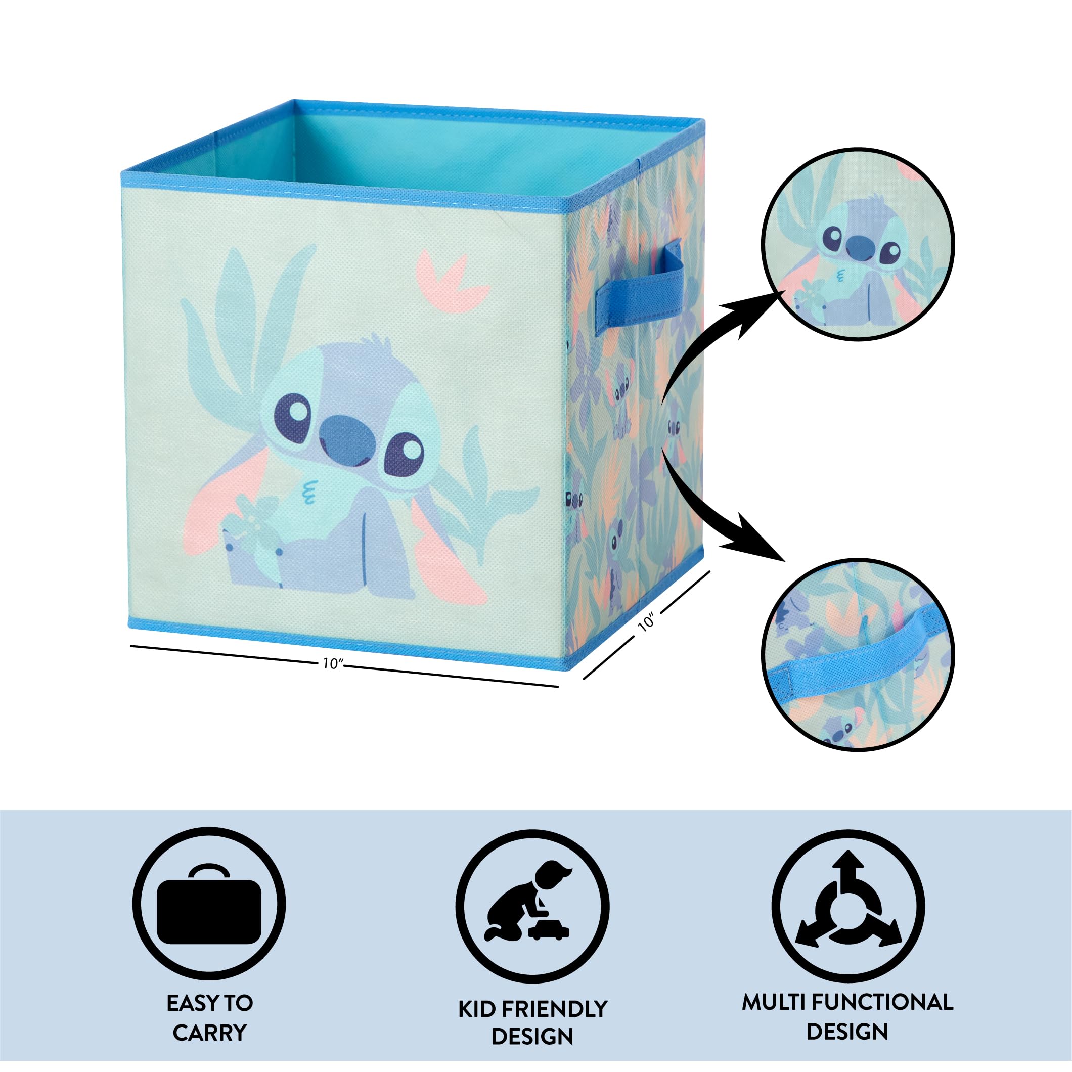 This Stitch 2-Pack storage cubes are a practical way to keep your space organized. The cubes are very versatile and can add both organization and decoration to nearly any area. The set includes two storage cubes featuring adorable graphics of Disney Stitch. Perfect for toy storage, laundry, books, bathroom storage and more. The Stitch 2-Pack storage cubes can help make organizing your child's room Easy and fun. Dimensions: 10" X 10" X 10".