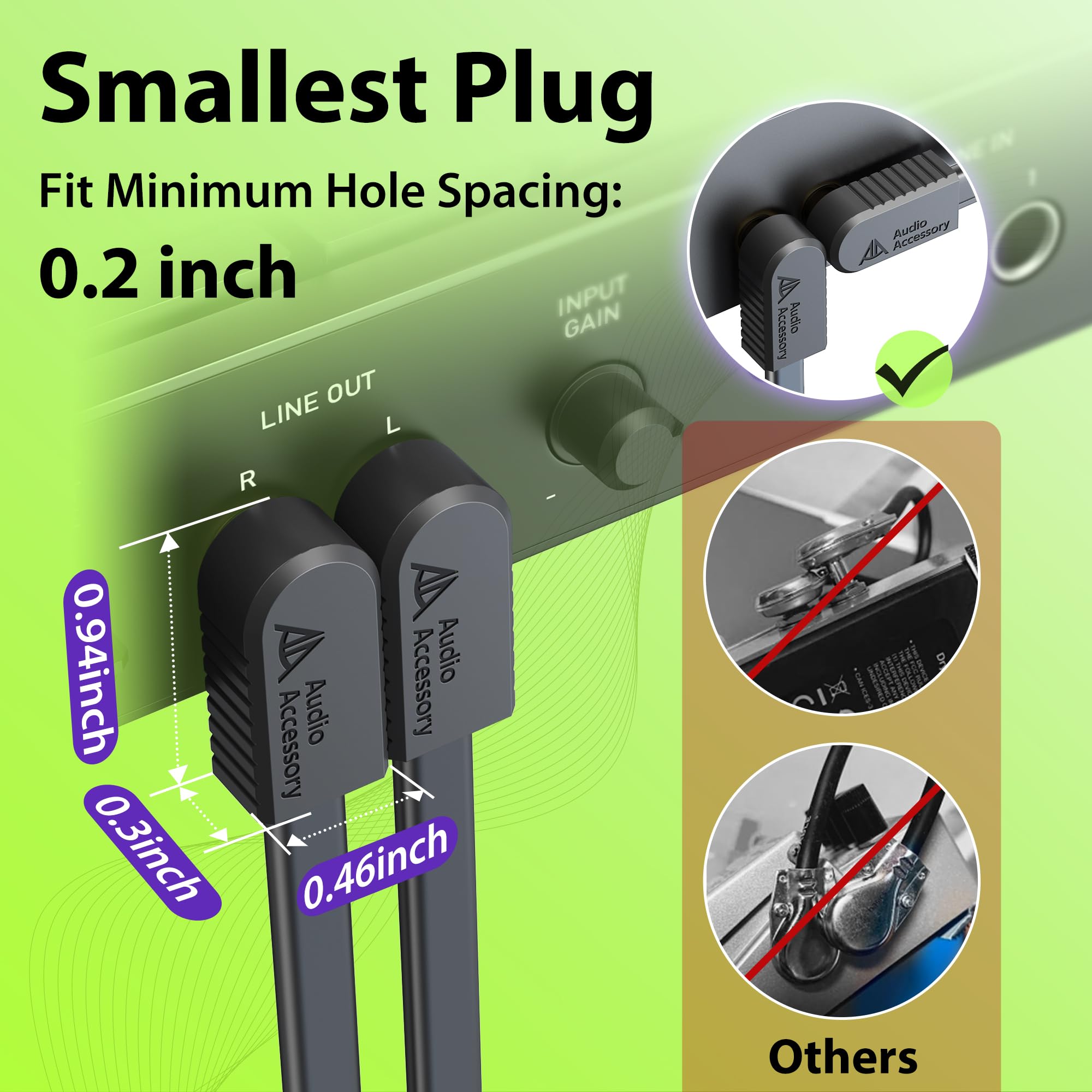[Fit Pedals with Closely Spaced Jacks] Even with pedals that feature extremely close two jacks - like those on the TC Electronic DITTO STEREO LOOPER, FLASHBACK 2 DELAY, MXR CSP042, M169, M234, Walrus Audio Mako Series, Danelectro Tuna Melt Tremolo Yellow, JHS Morning Glory V4 or BOSS Boss Chorus Pedal - our plugs fit perfectly and without interference (fitting hole spacing as tight as 0.2 inch). Never again deal with bulky plugs that block each other and won’t fit.