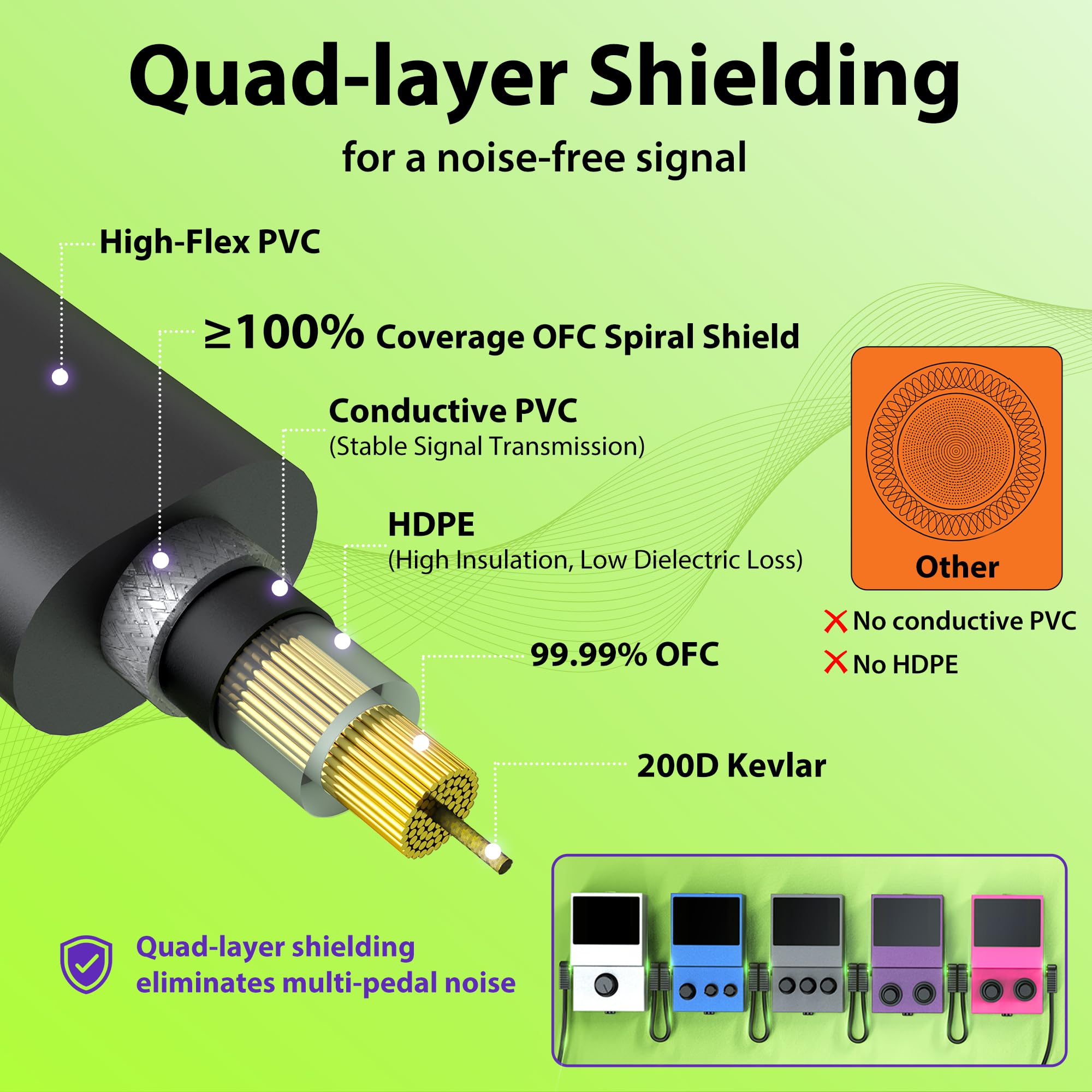 [Quad-layer shielding for No Noise] ≥100% OFC shielding blocks interference, while its four-layer shielding ensures pure, clear tone even when daisy-chaining multiple pedals. A dependable choice for guitarists who want guitar patch cables with professional, noise-free performance.