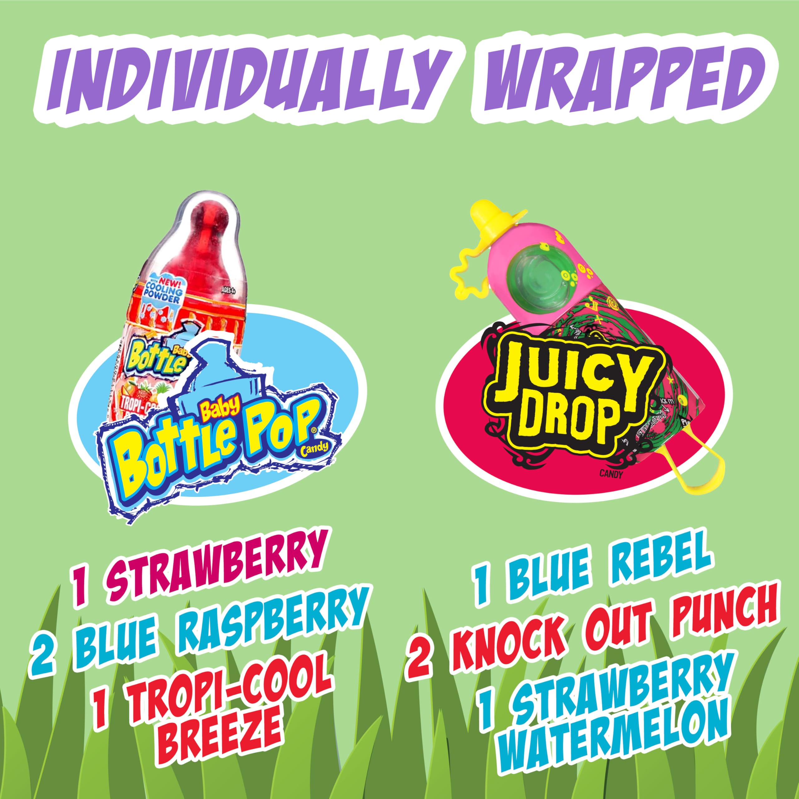 ASSORTED CANDY FLAVORS: Contains a selection of mouth-watering fruity flavors including Strawberry, Blue Raspberry, Fruit Punch, Watermelon, Strawberry-Watermelon, Knock-Out Punch, Blue Rebel, and Tropi-Cool Breeze