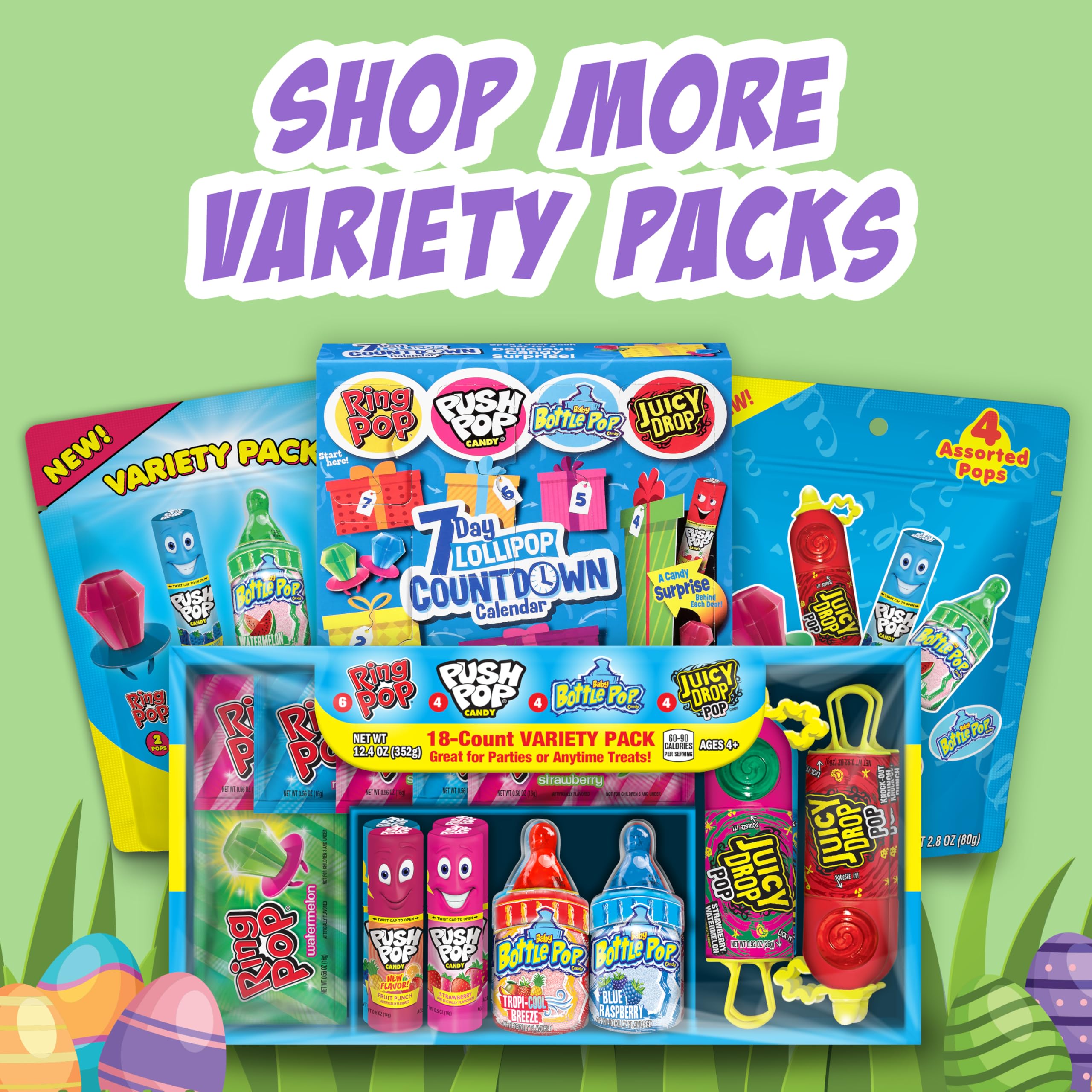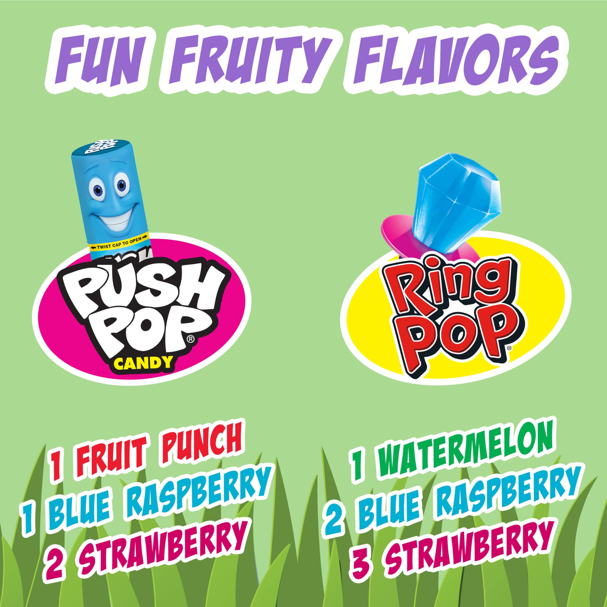 Bazooka Candy Brands lollipop candy mix is the ultimate bulk variety of hard candy this Easter Perfect for Easter this candy box comes with an assortment of iconic Ring Pop, Push Pop, Baby Bottle Pop, and Juicy Drop lollipops in several flavors. Bazooka Candy Brands' variety box is the gift that keeps on giving Deliciously simple, this variety of Ring Pop and Push Pop lollipops have endless possibilities -- you can take them as Easter candy boxes, hand them out as party favors at the next party, or enjoy some with kids at home. Each 18-count variety candy box contains 6 Ring Pop lollipops, 4 Push Pop lollipops, 4 Baby Bottle Pop lollipops, and 4 Juicy Drop lollipops in an assortment of fruity flavors: Strawberry (all), Blue Raspberry (all), Watermelon (BBP), Cherry Watermelon (PP). Unwrap the fun at your upcoming party because the variety pack means there are different tasty flavors for each to enjoy, but enough to go around and share the fun together Bazooka Candy Brands' variety mix of hard candy lollipops is ideal for sharing Our Easter Day lollipop assortment is shelf-stable and long-lasting. Disclaimer: Not for children 3 and under.