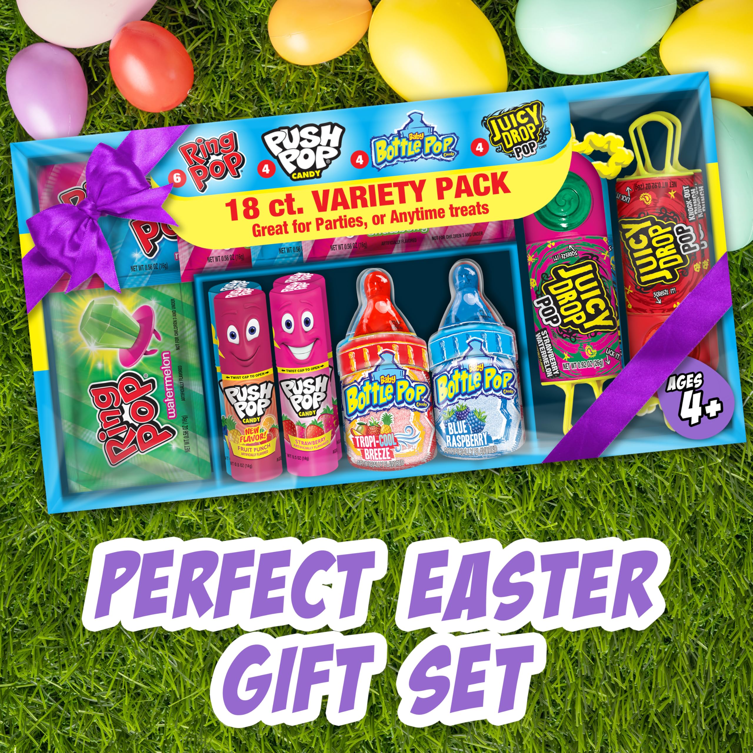 BULK EASTER CANDY BOX: Our 18-count variety box brims with childhood favorites, featuring 6 Ring Pops, 4 Push Pops, 4 Baby Bottle Pops, and 4 Juicy Drops. Perfect for Easter parties, gift baskets, and candy bowls
