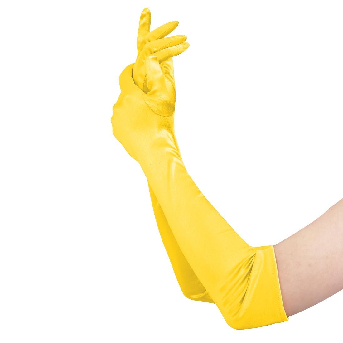 Description Women's White Long Satin Gloves Bridal Dance Gloves For Special Occasion Evening Party, Black, White, Pink, Red Material: Made of 90% Nylon + 10% Spandex, stretchy and easy to put on. Stretch ,soft, smooth, sleek, comfortable to wear The best to hand wash and air dry. Package include: 1 Pair Gloves.