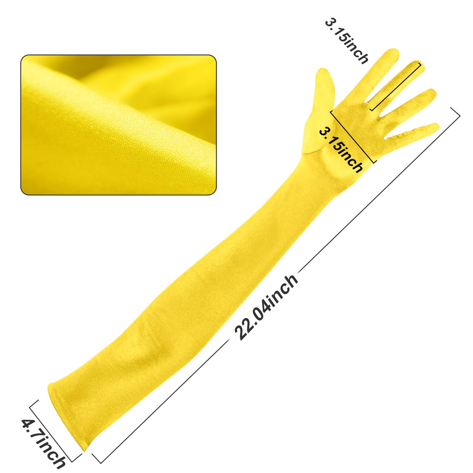 Dimension - The length of these opera gloves are approximately 21.6 inches from the fingertip to the end of the glove. The end width is 4.7 inches when laying flat, suitable for most adults.