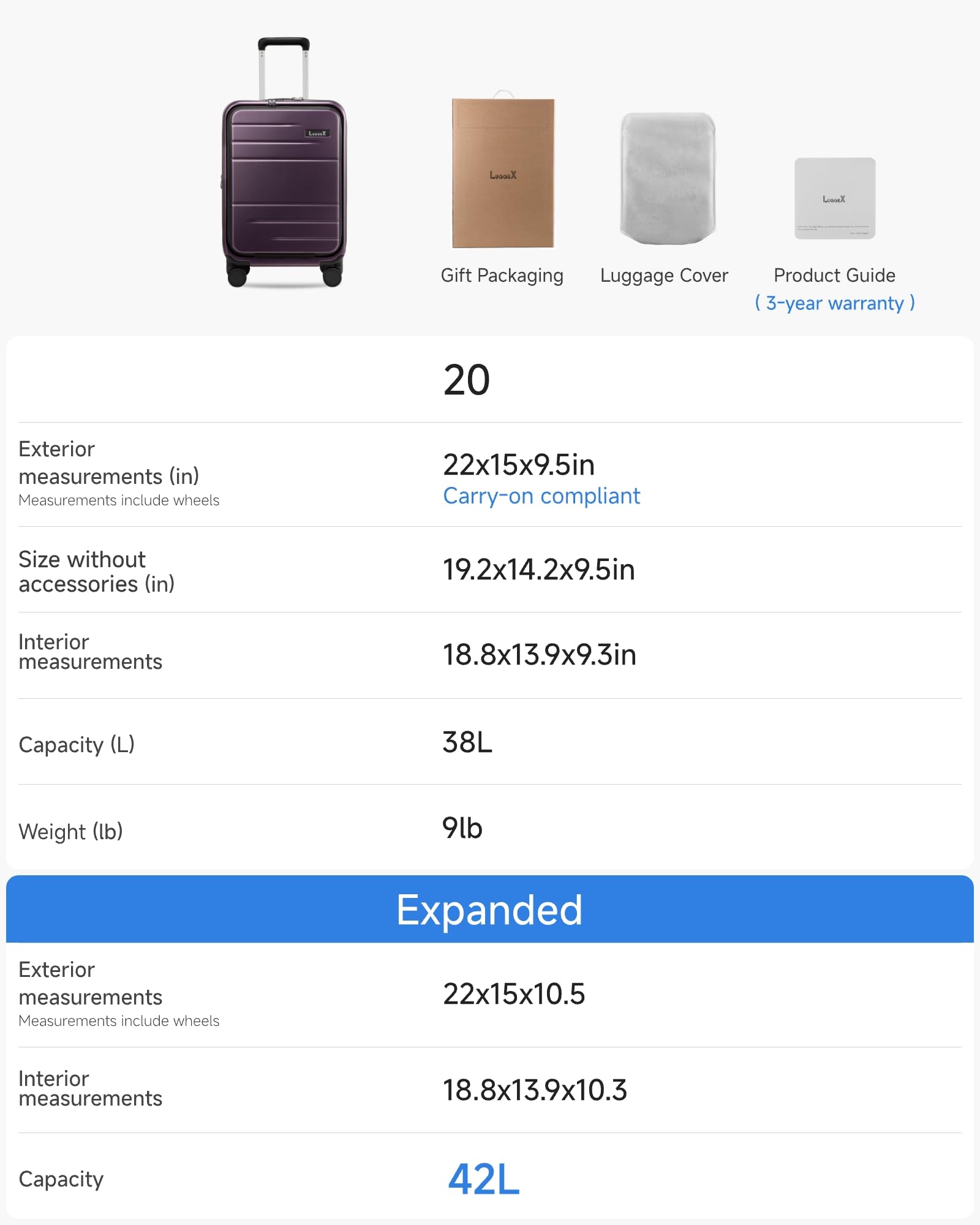 External Dimensions(including wheels and handles): 22x15x9.5 IN(Expanded: 22x15x10.5 IN), Internal Dimensions: 18.8x13.9x9.3 IN(Expanded: 18.8x13.9x10.3 IN), Weight: 9 LB, Total Capacity: 38L(Expanded: 42L)