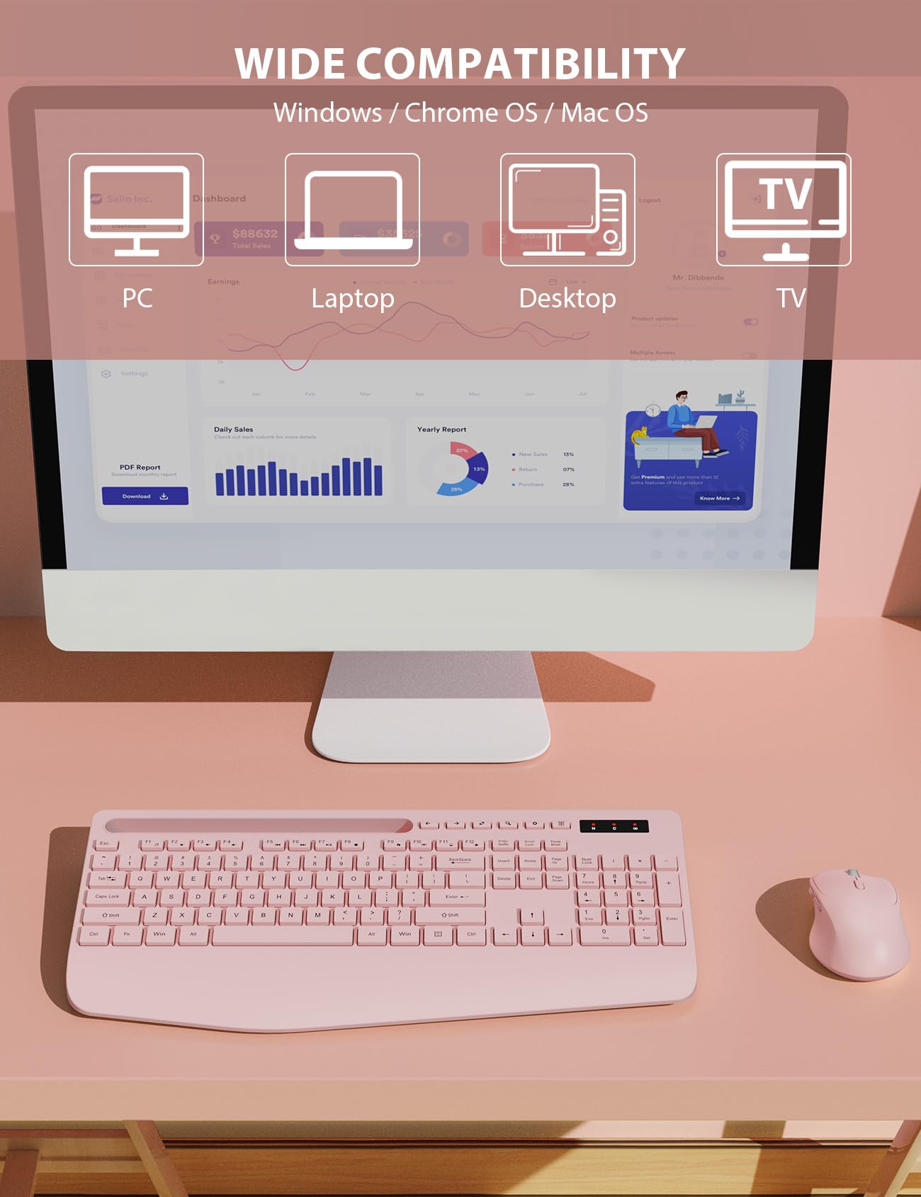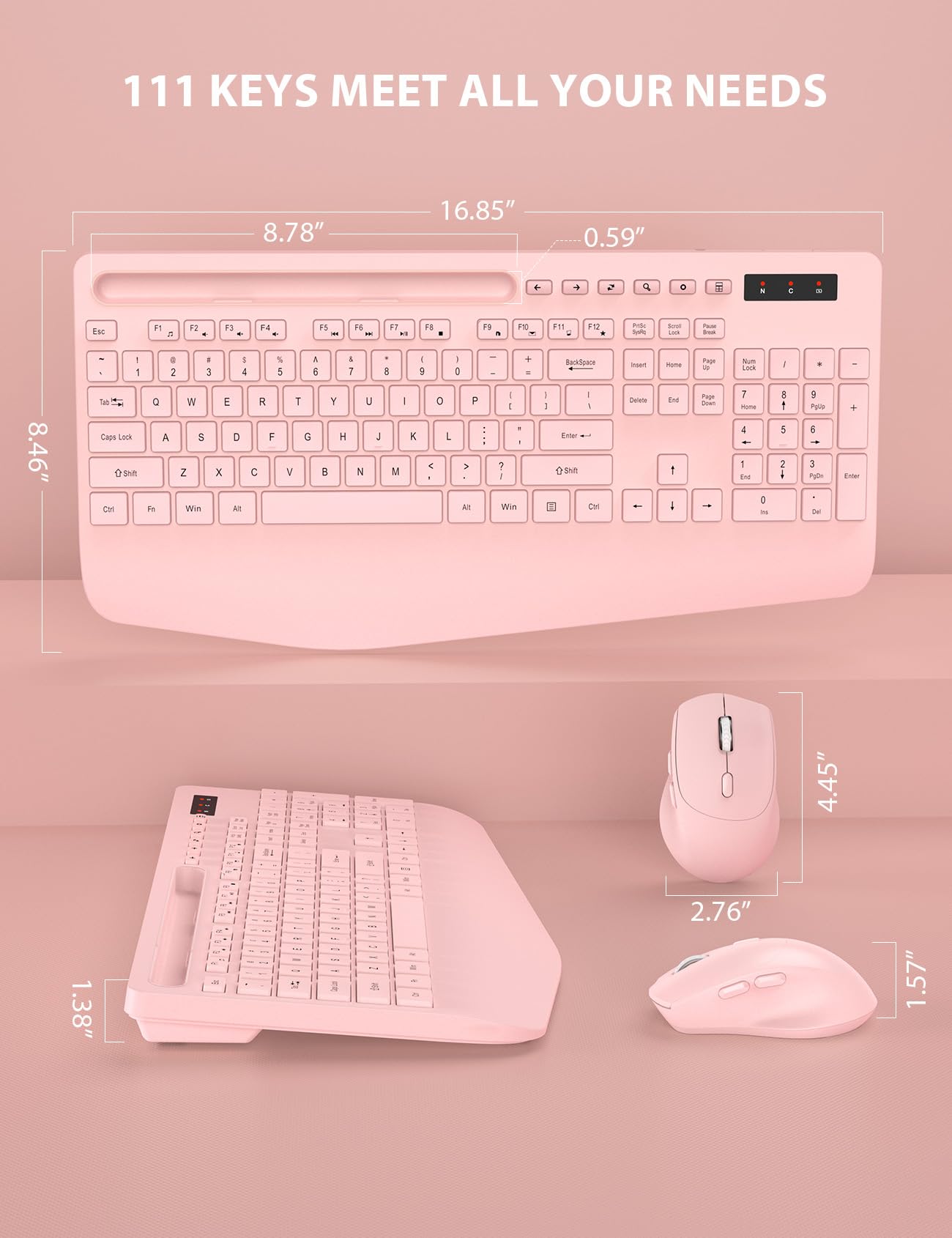 FULL-SIZE KEYBOARD WITH HOLDER - Even when working with this keyboard mouse combo, you'll never miss any messages from your phone, since the built-in cradle can prop up your phone or tablet at a perfect angle to read or watch videos.